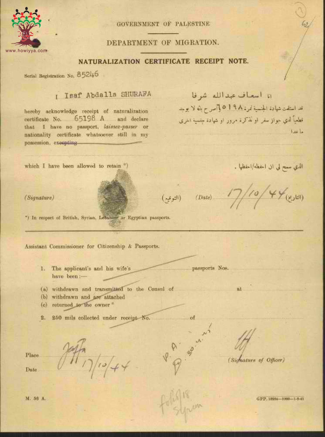 ايصال موقع من اسعاف عبد الله الشرفا باستلام شهادة الجنسية الفلسطينية