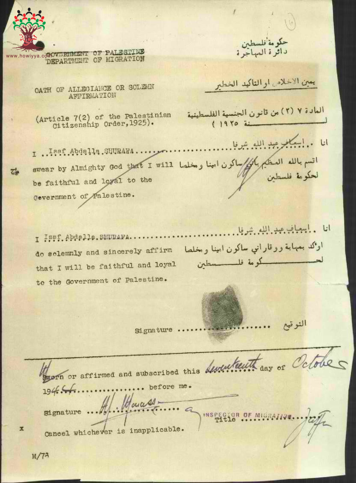 اسعاف عبد الله الشرفا توقع على يمين الإخلاص للحصول على شهادة الجنسية الفلسطينية