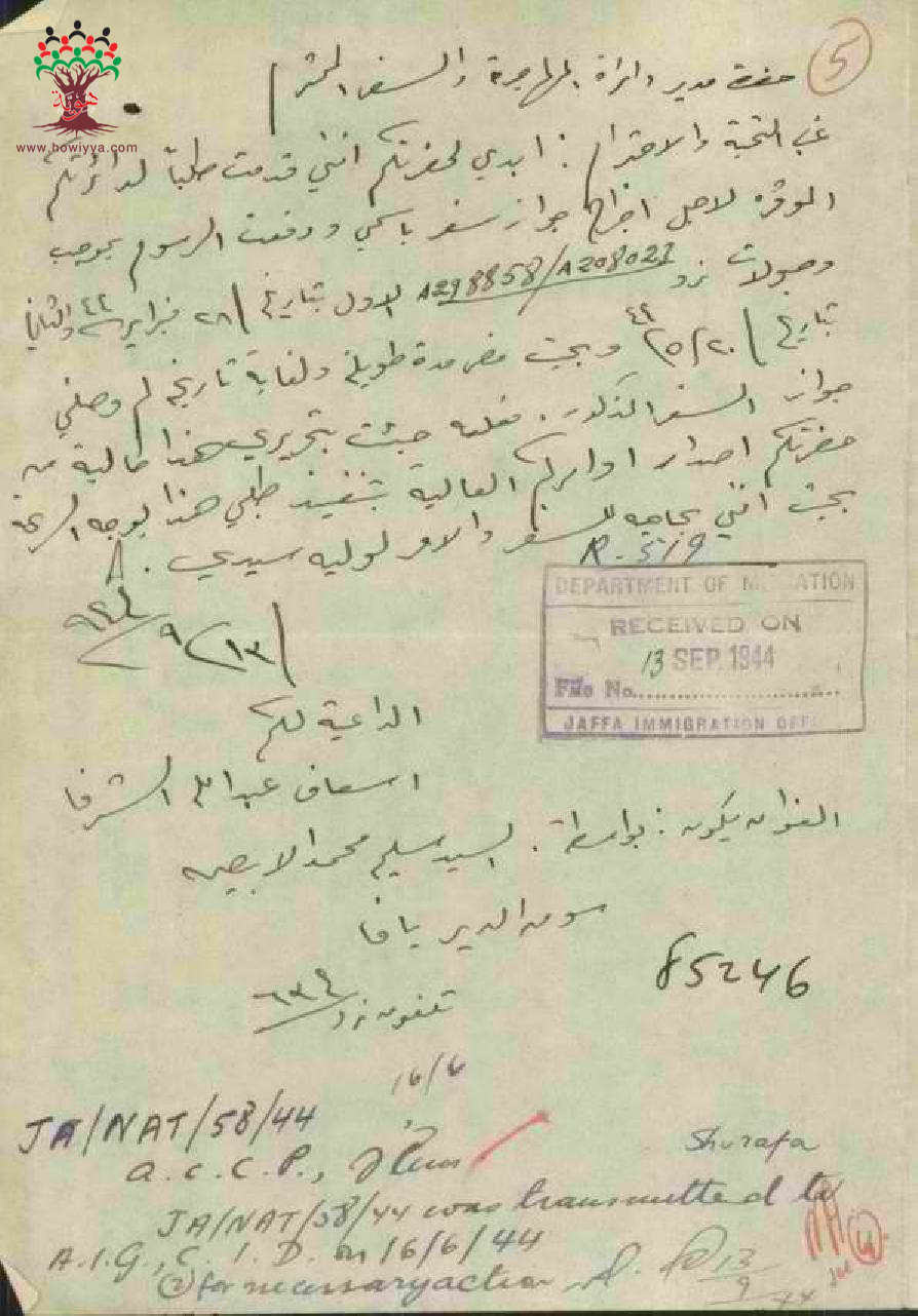 رسالة من اسعاف عبد الله الشرفا إلى مدير دائرة المهاجرة بخصوص طلب الجنسية الفلسطينية
