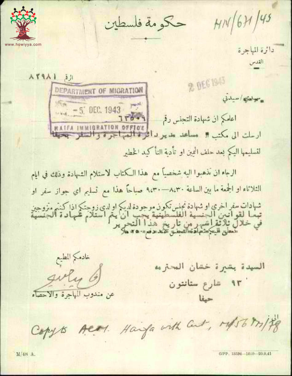 رسالة من دائرة المهاجرة إلى بشيرة خشان بخصوص استلام شهادة الجنسية الفلسطينية