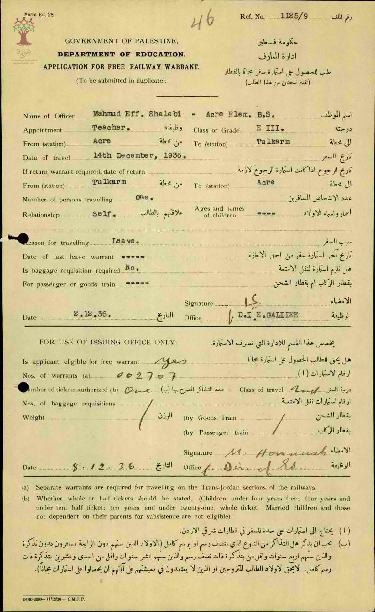 استمارة سفر مقدمة الى المعلم محمود شلبي/عكا