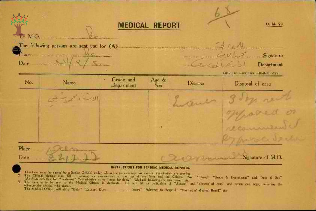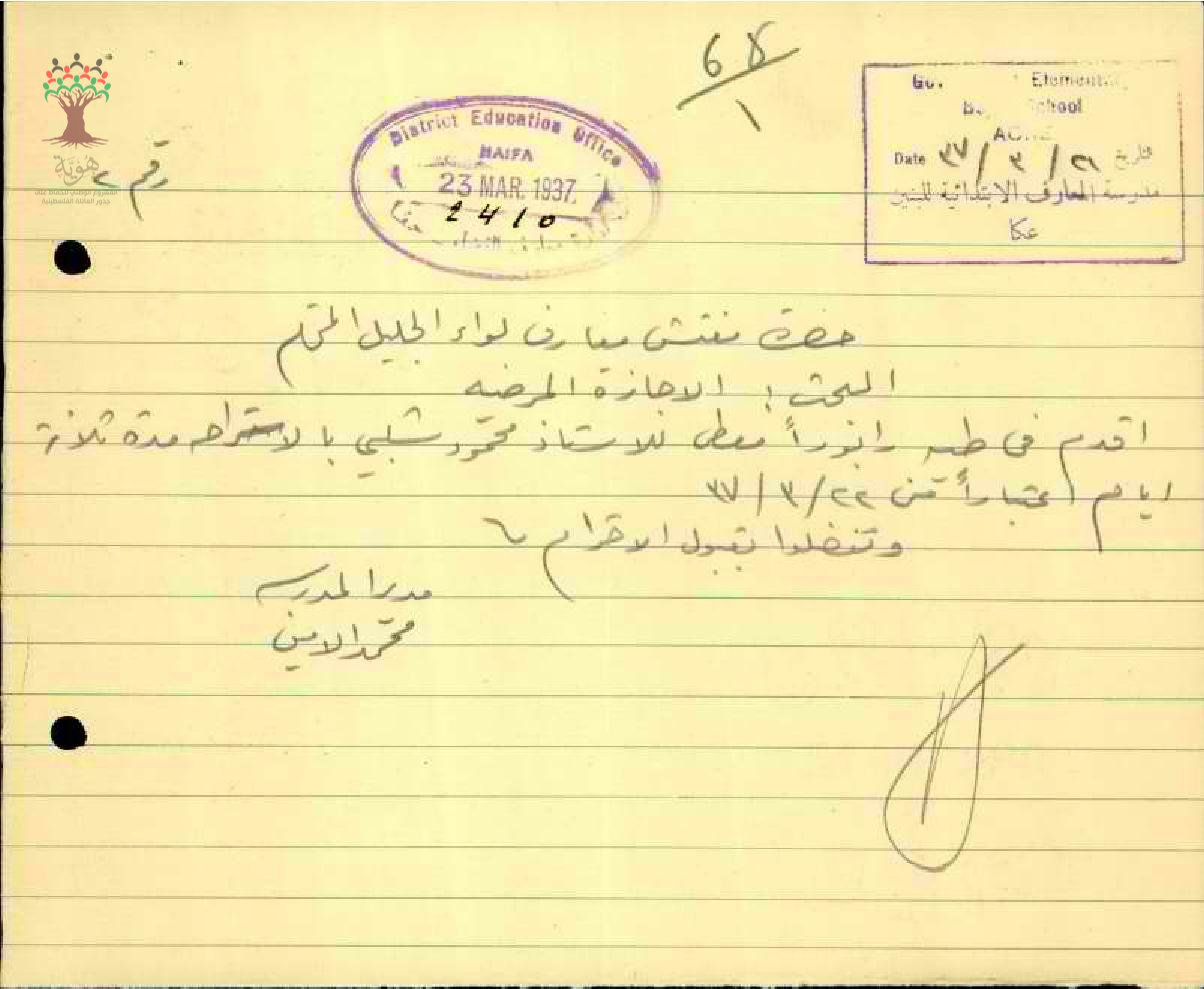 رسالة من مدير مدرسة عكا الى مفتش المعارف بخصوص تغيب المعلم محمود شلبي مرفقة بالتقرير الطبي