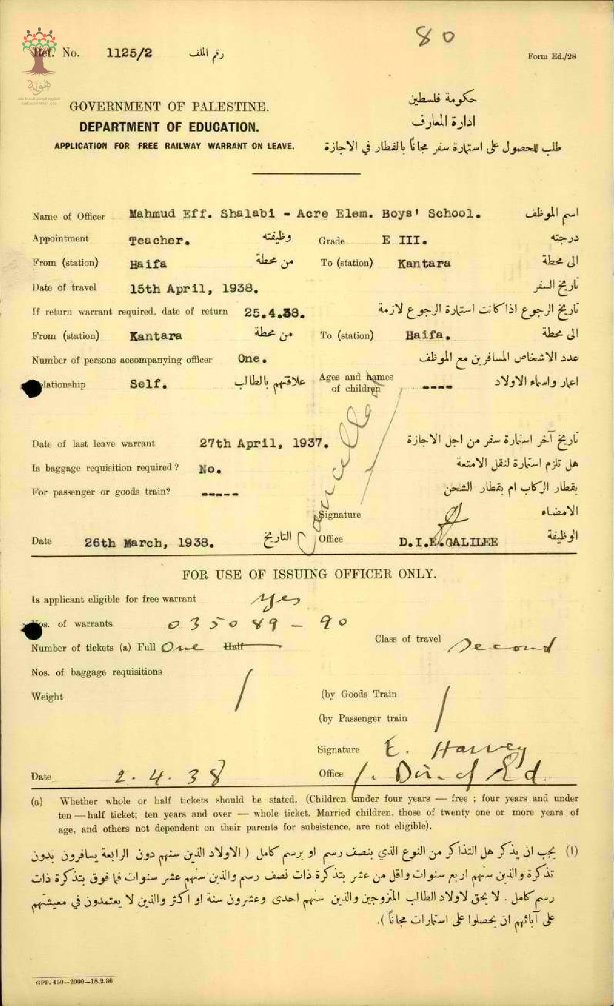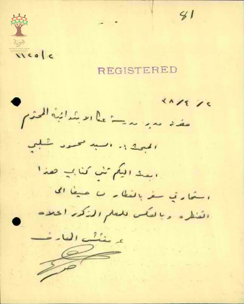 رسالة من مفتش المعارف الى المعلم محمود شلبي مرفقة باستمارة سفره السنوية