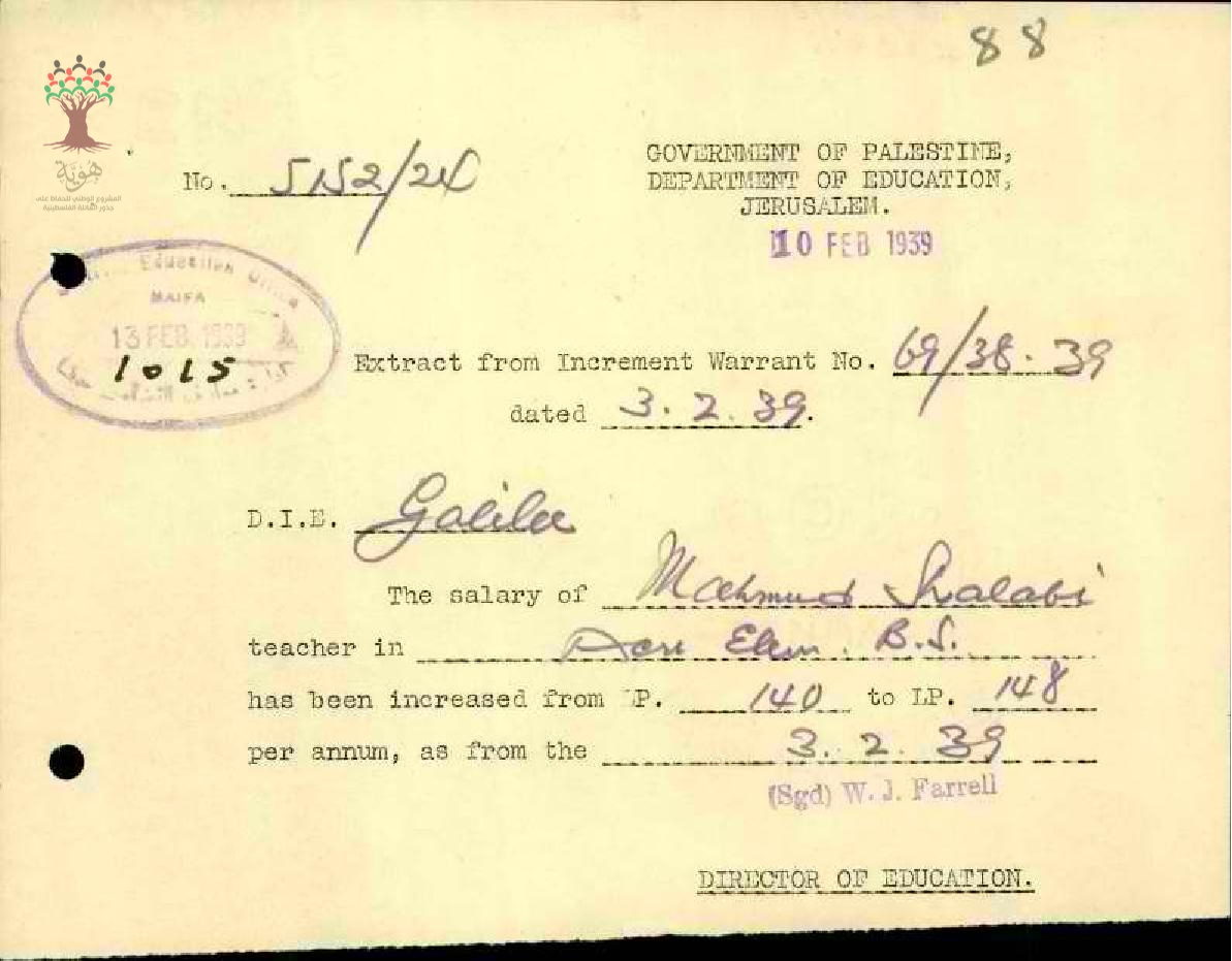 رسالة من مدير المعارف الى مفتش المعارف بخصوص زيادة راتب المعلم محمود شلبي السنوية
