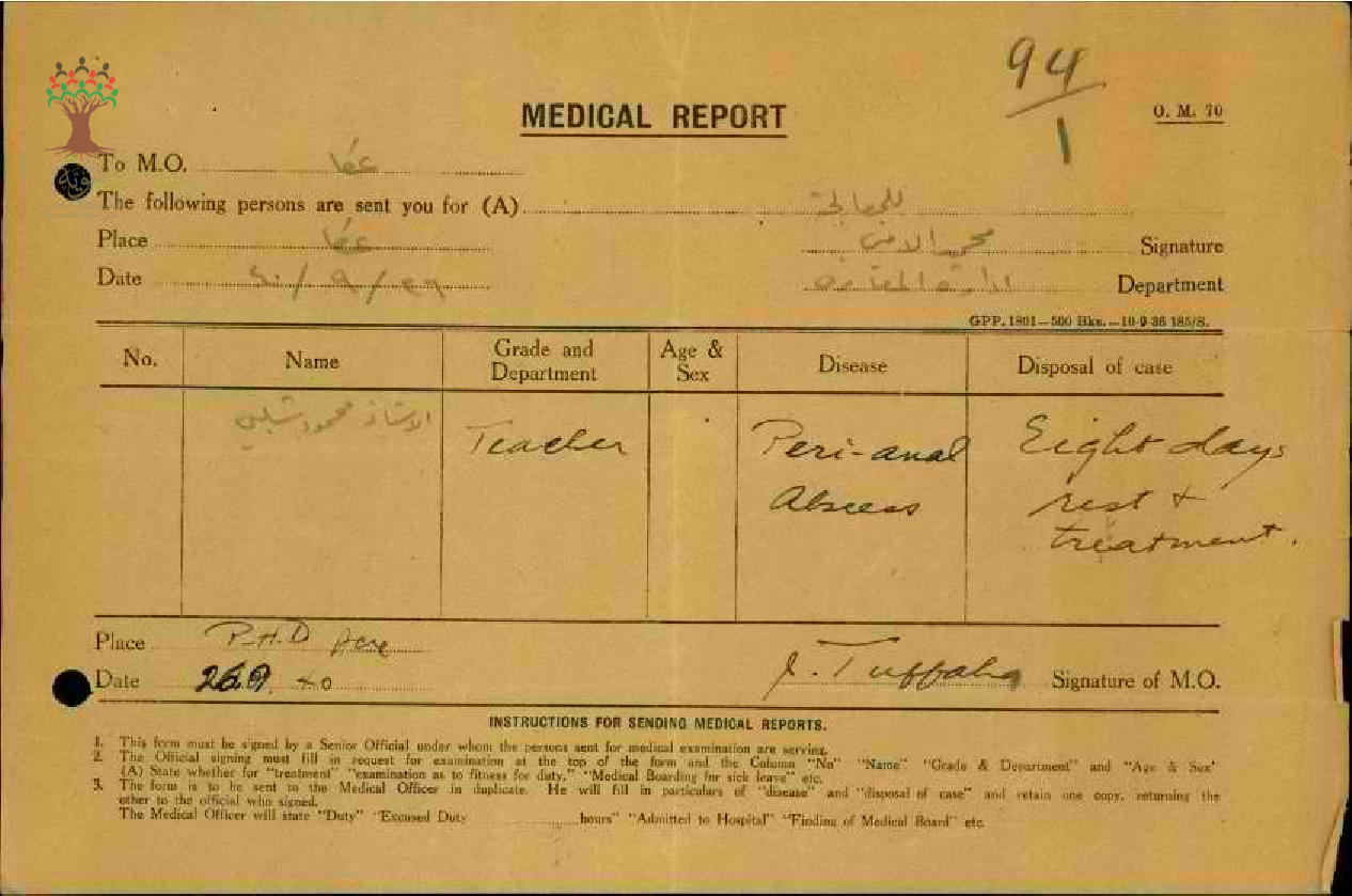 رسالة من مدير مدرسة عكا الى مفتش المعارف بخصوص تغيب المعلم محمود شلبي مرفقة بالتقرير الطبي