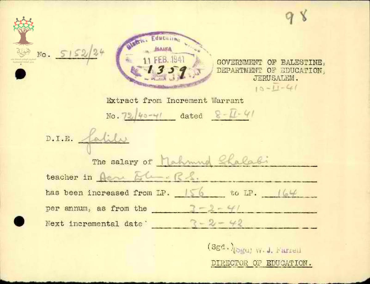 رسالة من مدير المعارف الى مفتش المعارف بخصوص زيادة راتب المعلم محمود شلبي السنوية