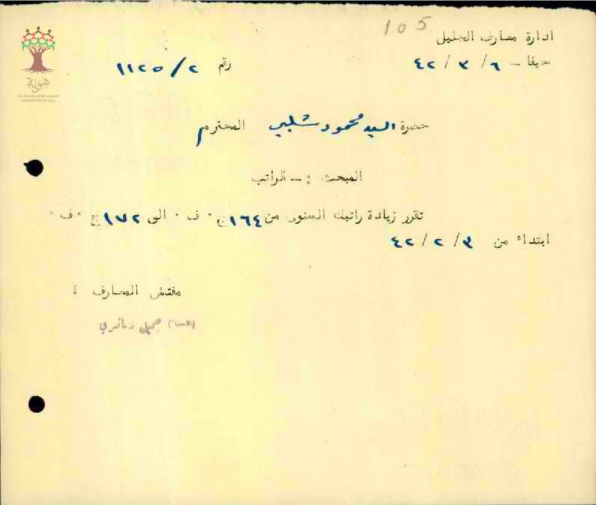 رسالة من مفتش المعارف الى المعلم محمود شلبي بخصوص زيادة راتبه السنوية