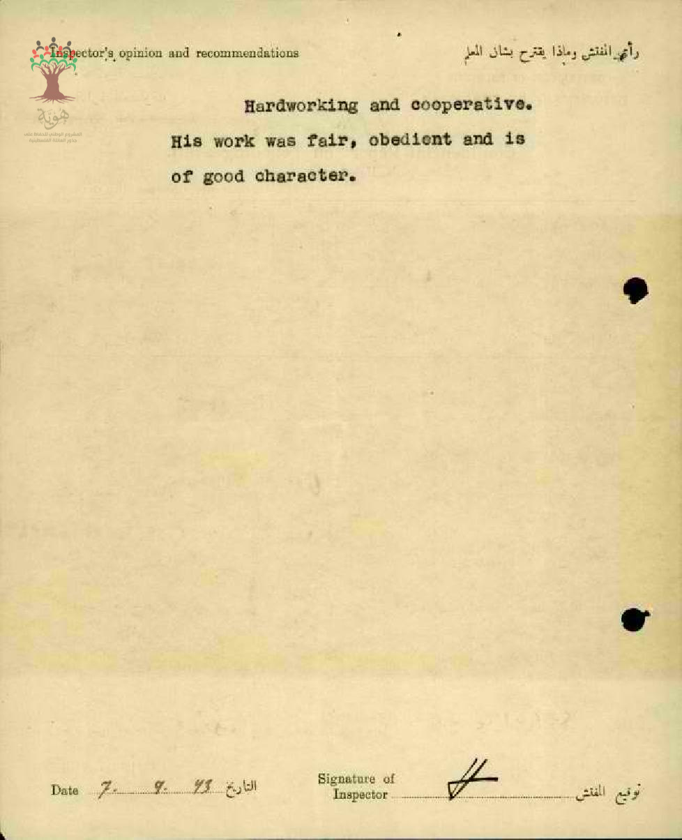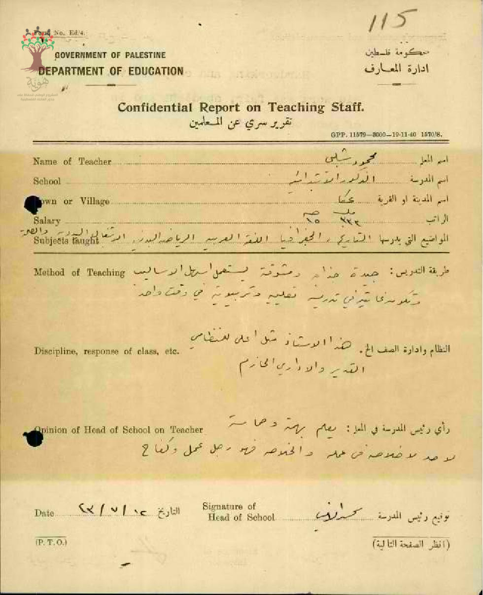 تقرير تفصيلي عن أداء المعلم محمود شلبي في مدرسة عكا سنة 1943