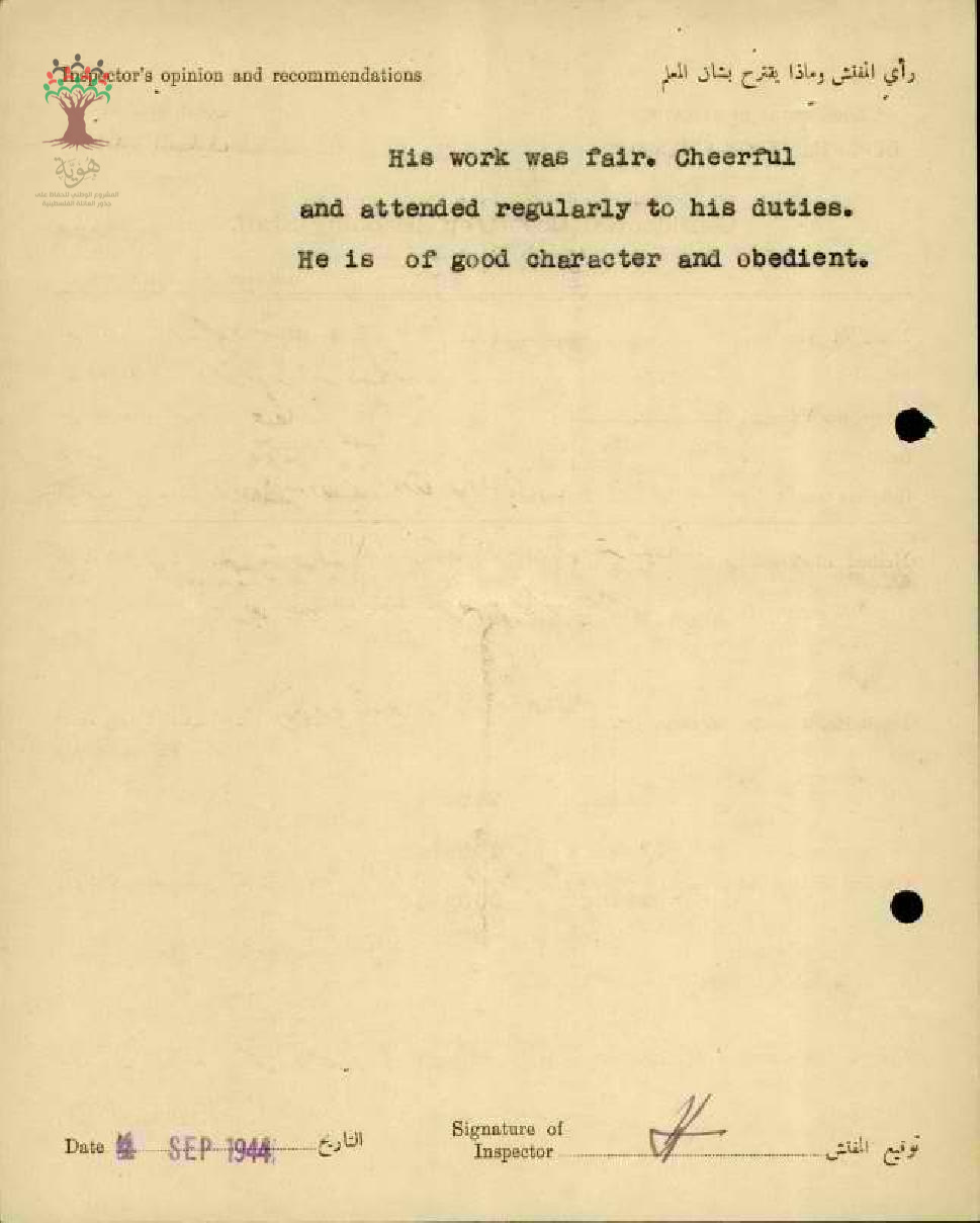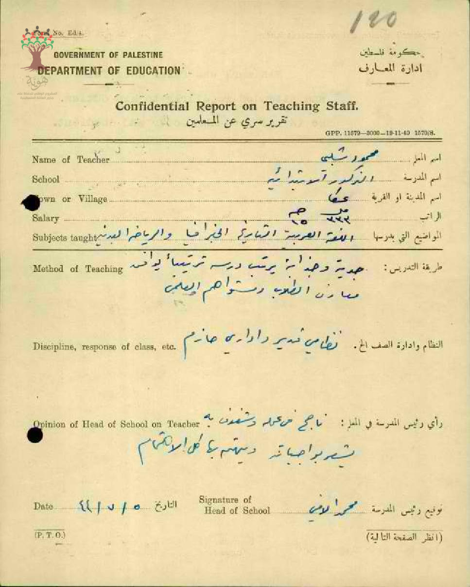 تقرير تفصيلي عن أداء المعلم محمود شلبي في مدرسة عكا سنة 1944