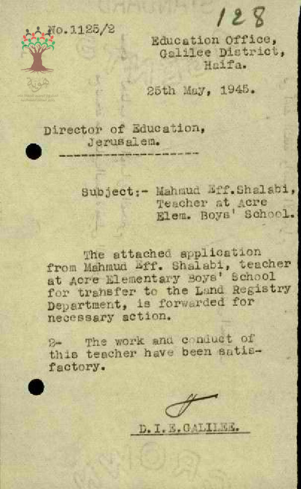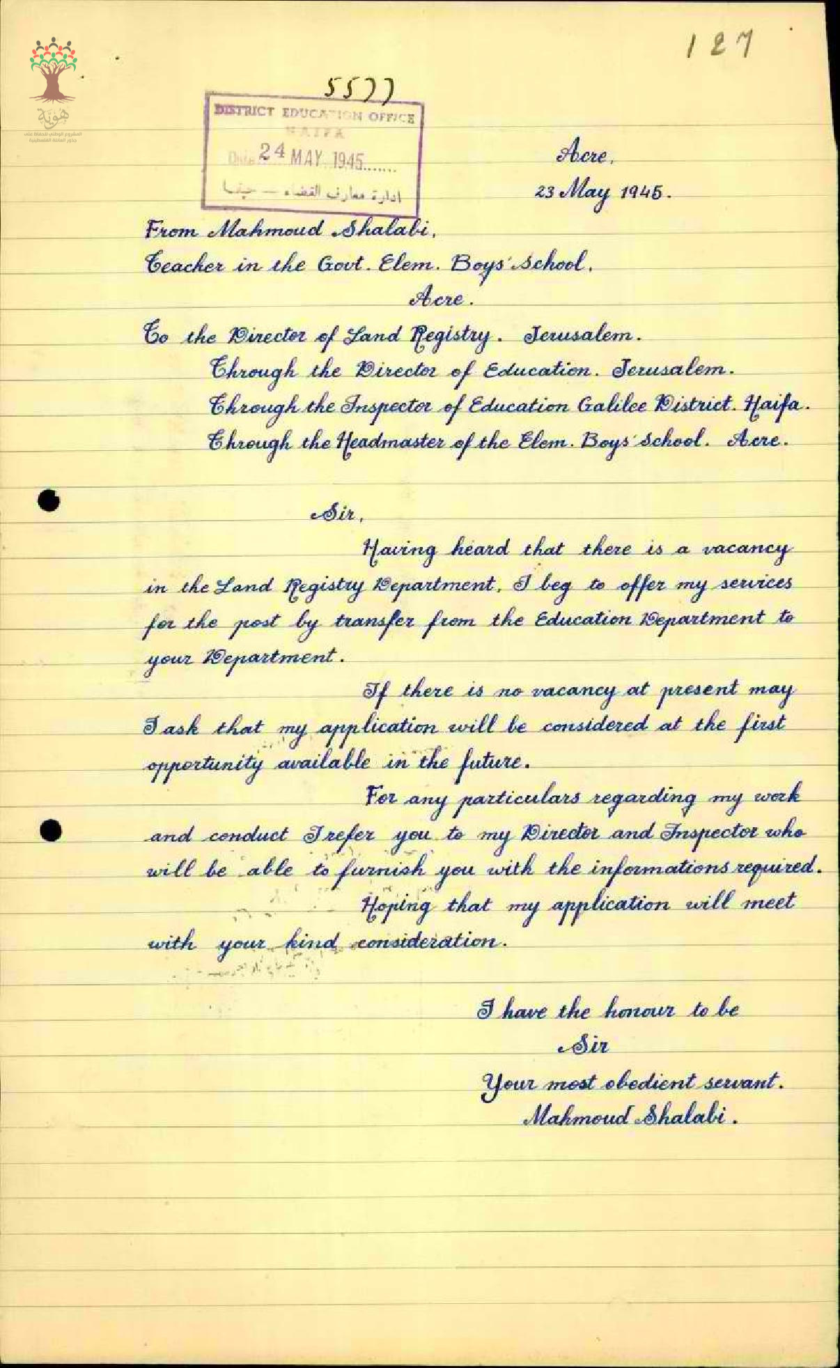 رسالة من مفتش المعارف الى مدير المعارف مرفقة برسالة من المعلم محمود شلبي يطلب فيها نقله من دائرة المعارف الى دائرة الزراعة
