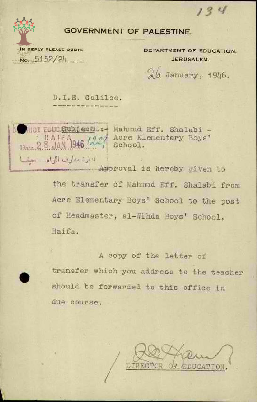 رسالة من مدير المعارف الى مفتش المعارف بخصوص الموافقة على نقل المعلم محمود شلبي من مدرسة عكا الى مدرسة الوحدة في عكا