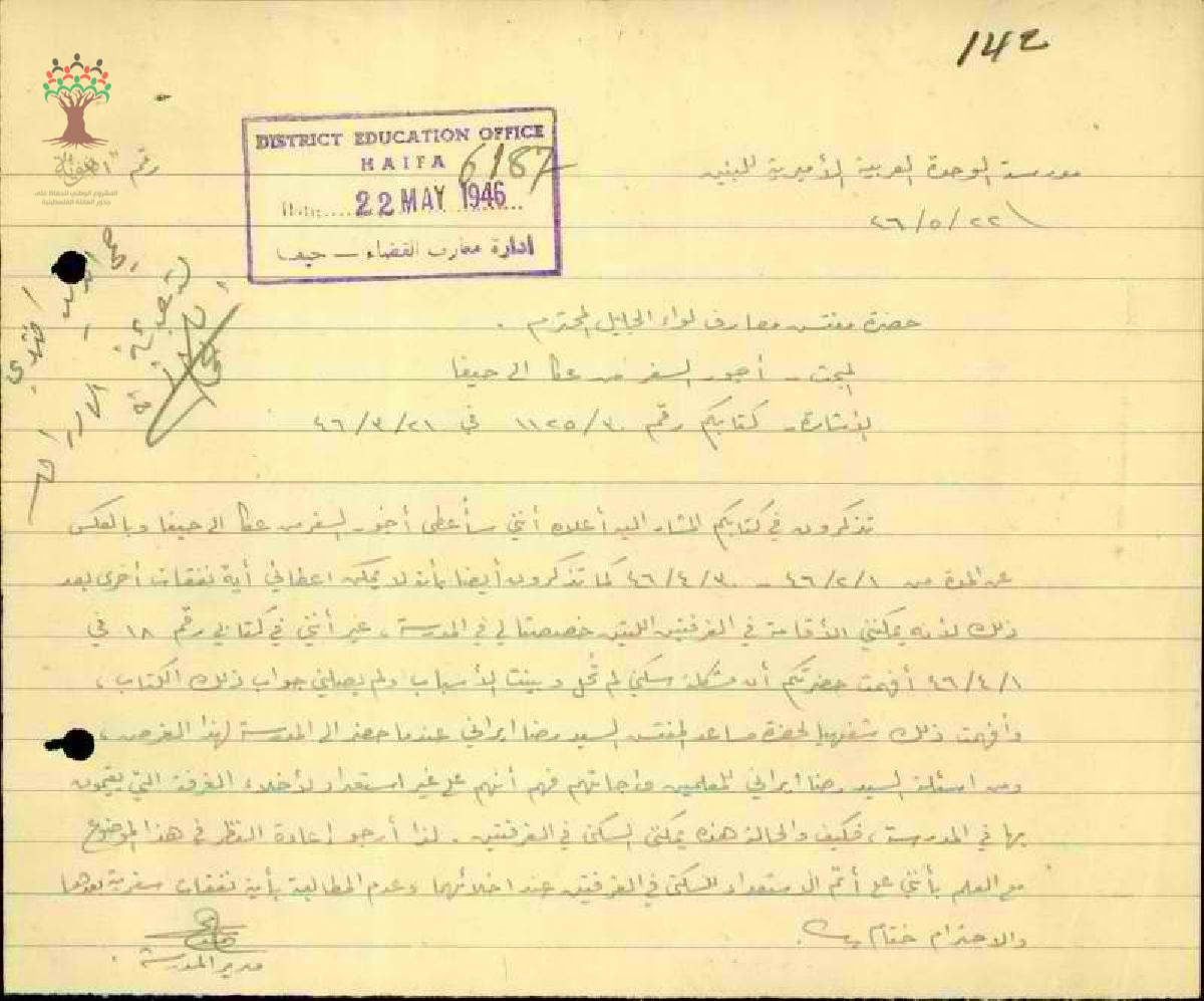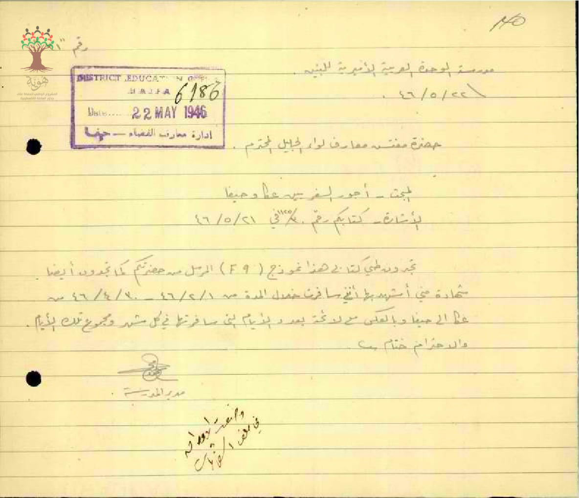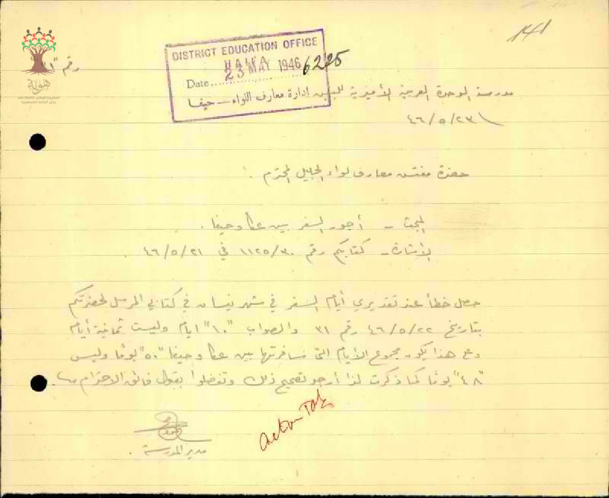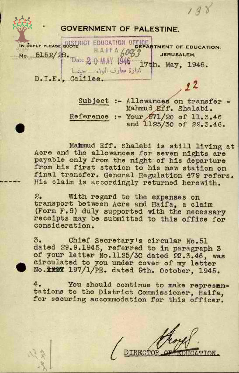 مجموعة رسائل بخصوص أجور سفر المعلم محمود شلبي بين عكا وحيفا