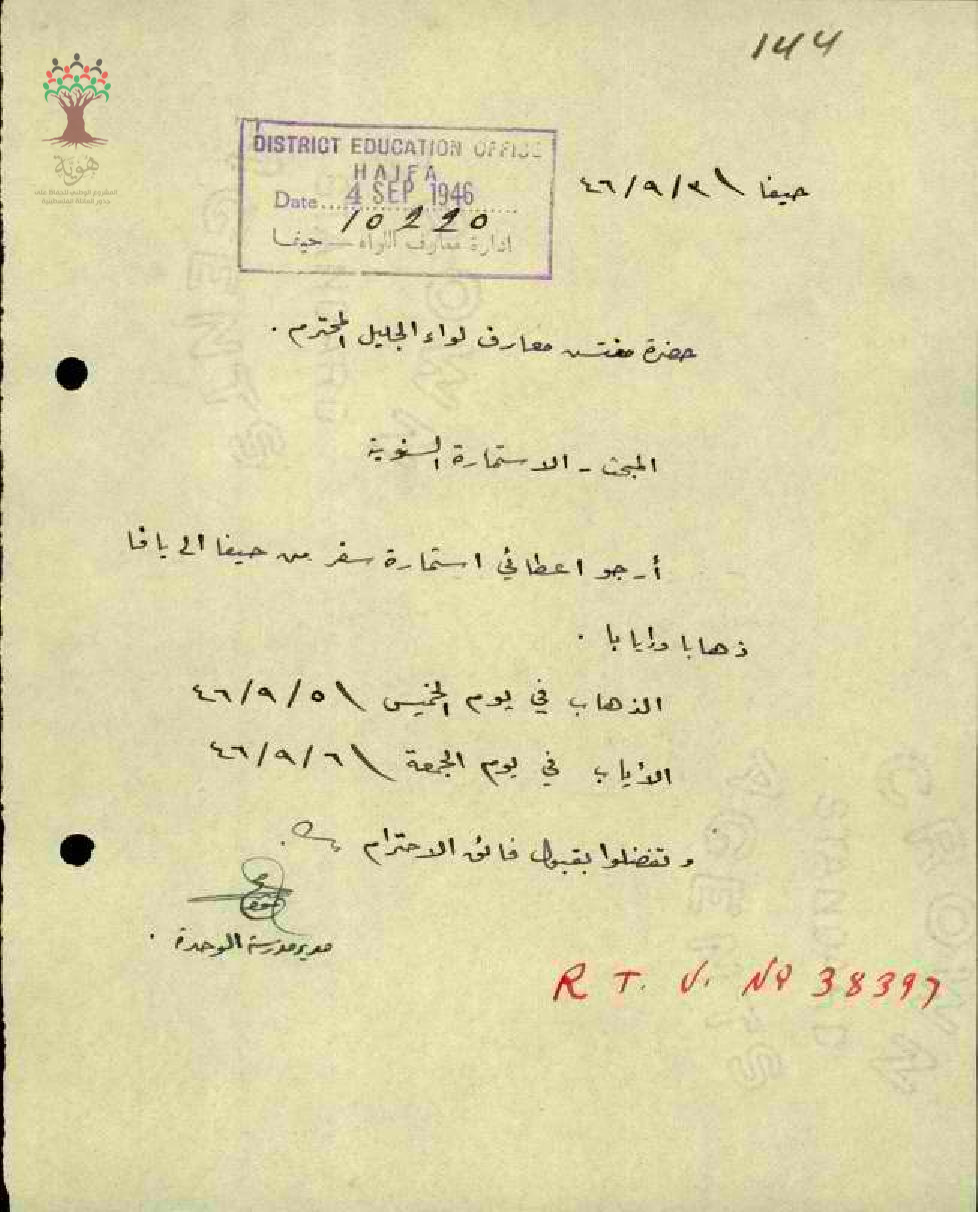 رسالة من المعلم محمود شلبي الى مفتش المعارف يطلب فيها استمارة سفره السنوية