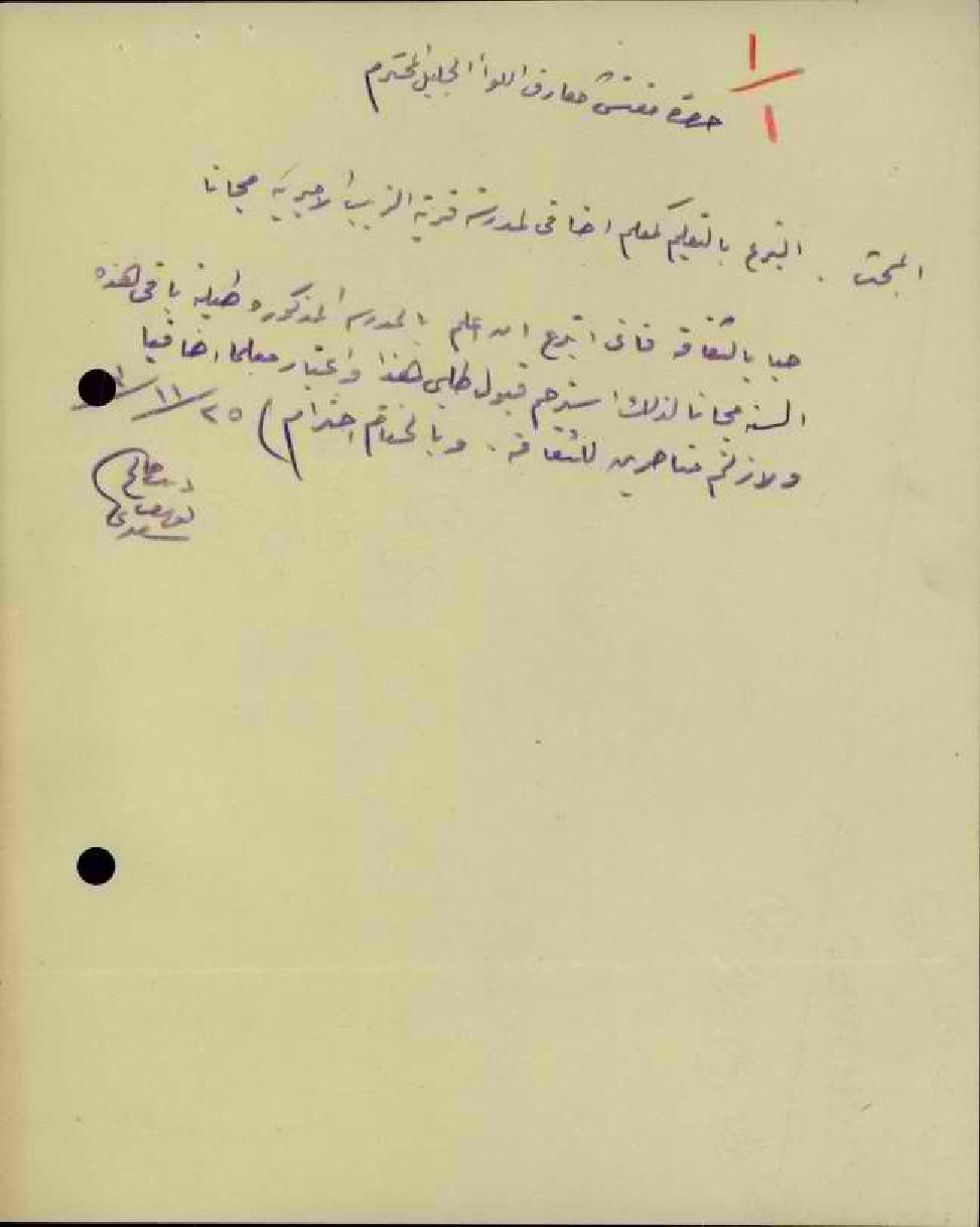 رسالة من المعلم ديب السعدي الى مفتش المعارف يعرض فيها التبرع للتعليم في مدرسة الزيب لبقية العام