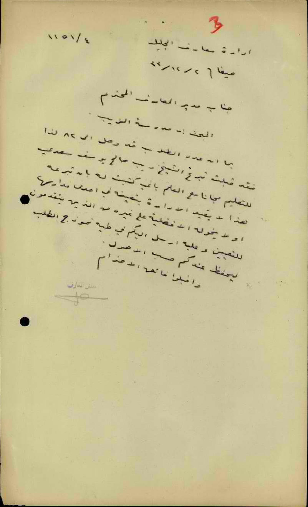 رسالة من مفتش المعارف الى مدير المعارف يخبره بالموافقة على تبرع المعلم ديب السعدي التعليم في مدرسة القرية