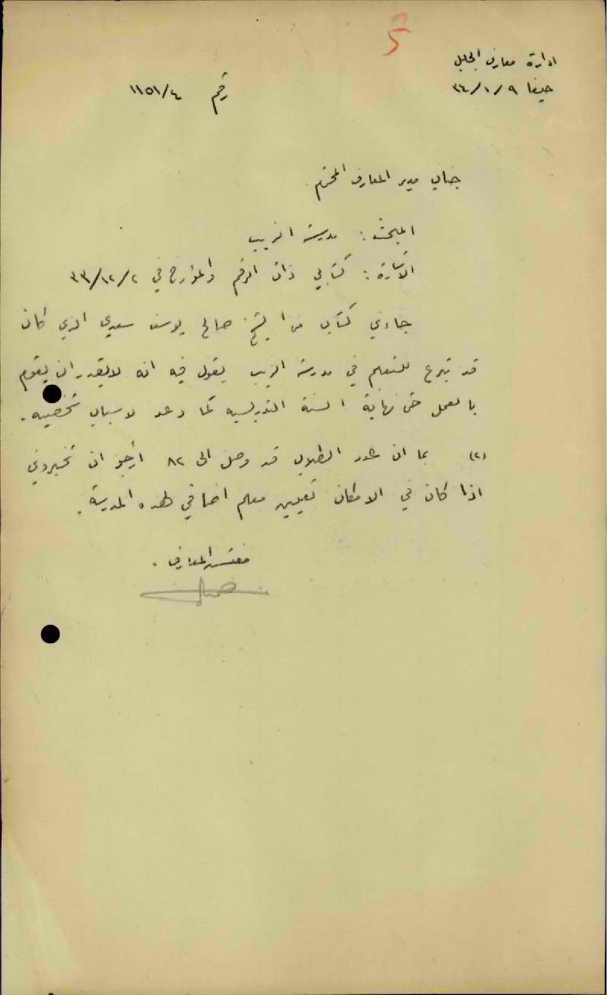 رسالة من مفتش المعارف الى مدير المعارف يخبره بأن المعلم ديب السعدي قد ترك عمله لأسباب شخصية