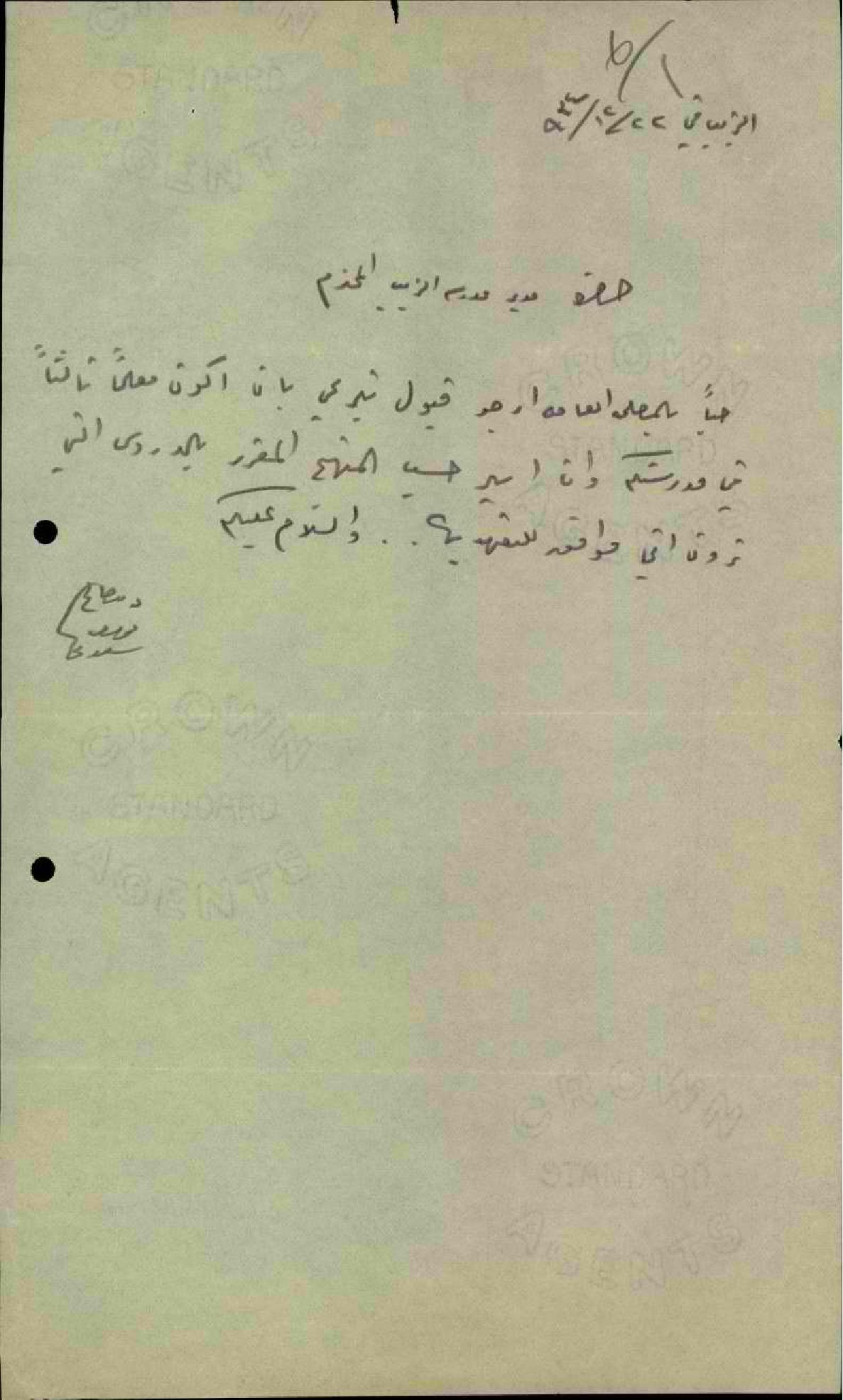 رسالة من المعلم ديب السعدي الى مدير مدرسة الزيب يتبرع أن يعمل كمعلم ثابت في المدرسة