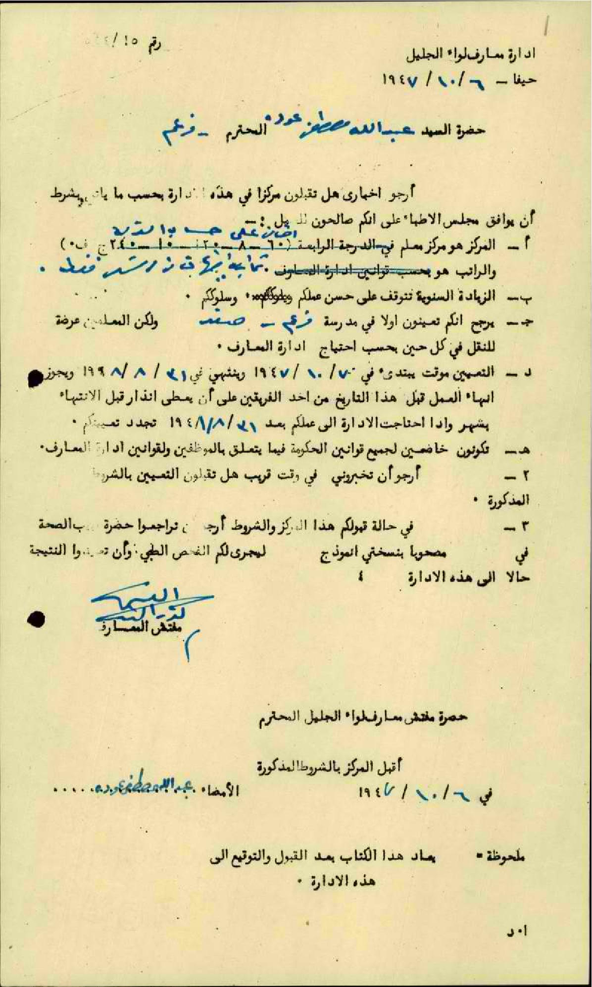 رسالة من مفتش المعارف الى المعلم عبد الله مصطفى عودة يعرض عليه مركز معلم في مدرسة فرعم