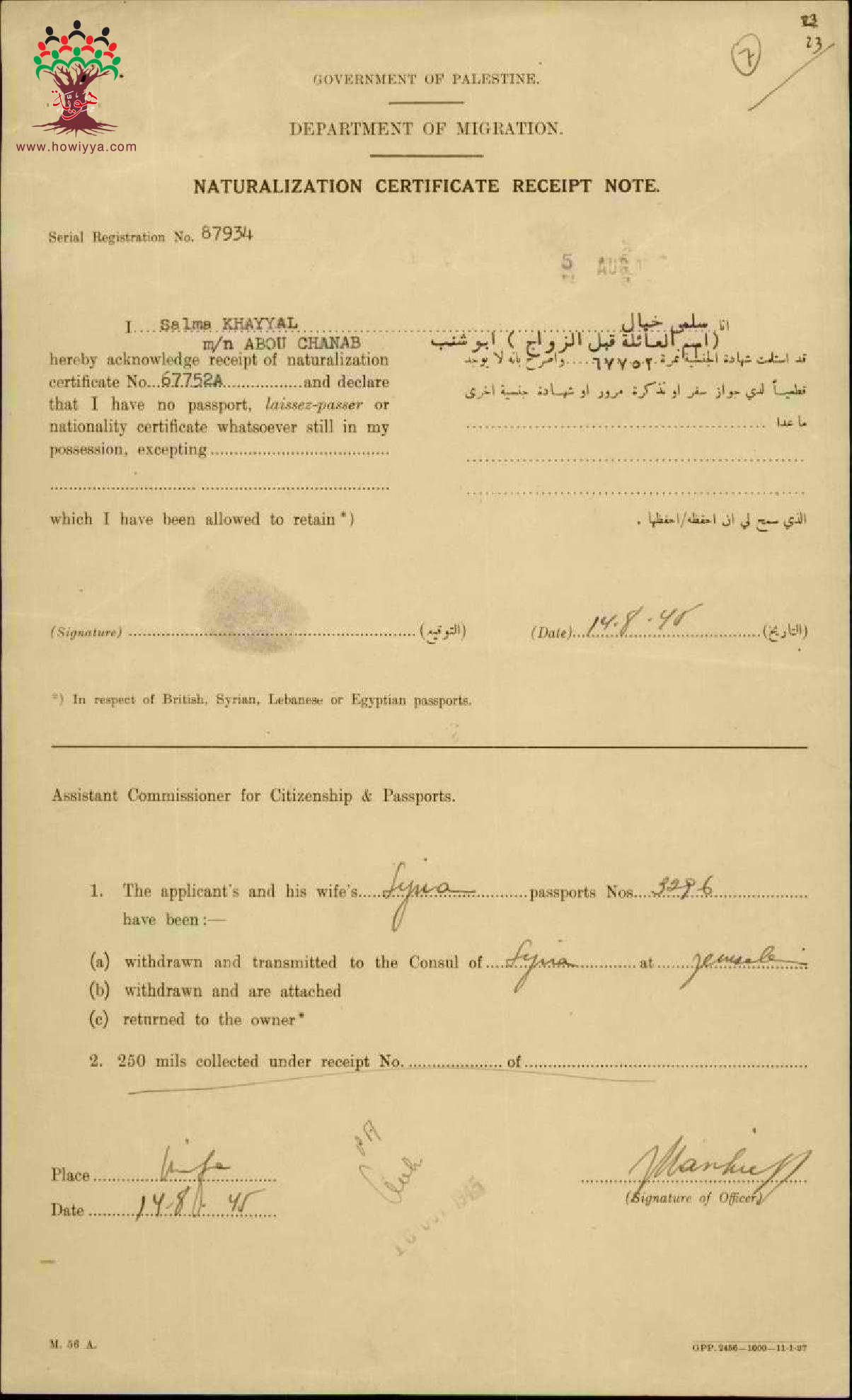 ايصال موقع من سلمى خيال (ابو شنب) باستلام شهادة الجنسية الفلسطينية