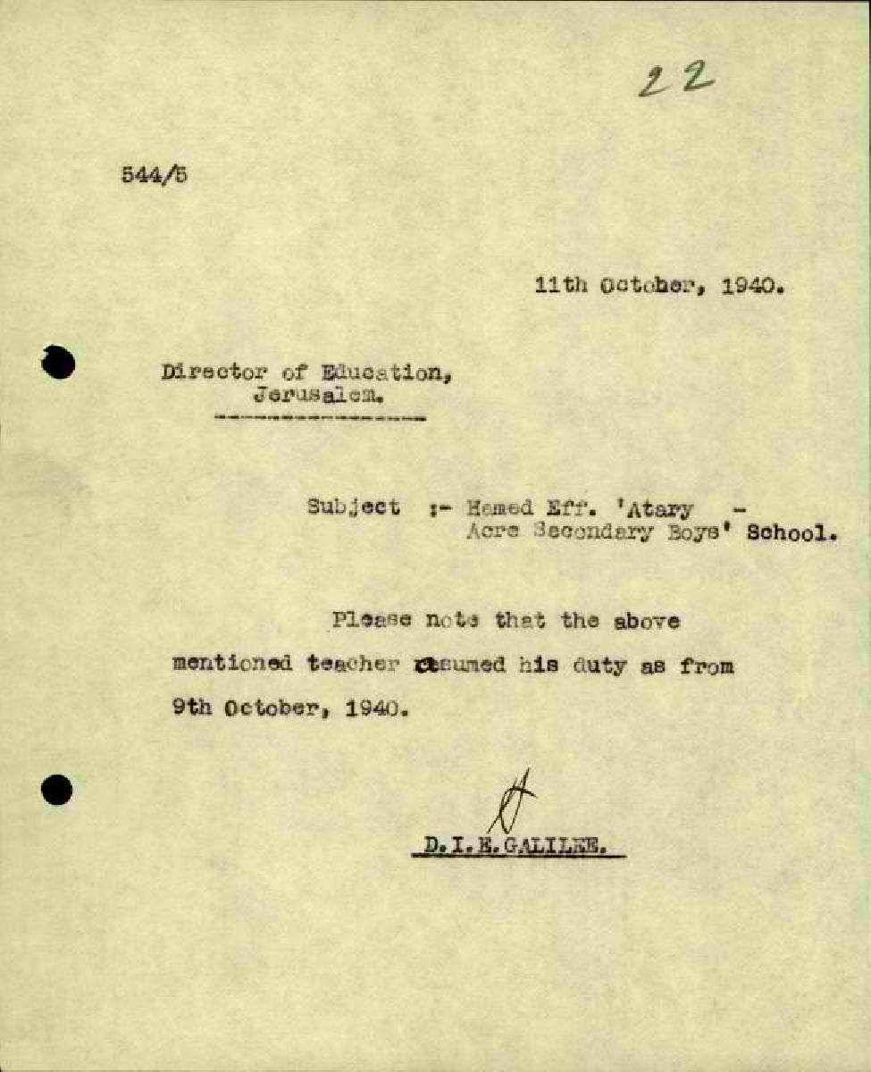 رسالة من مفتش المعارف الى مدير المعارف بخصوص مباشرة المعلم حامد عطاري عمله
