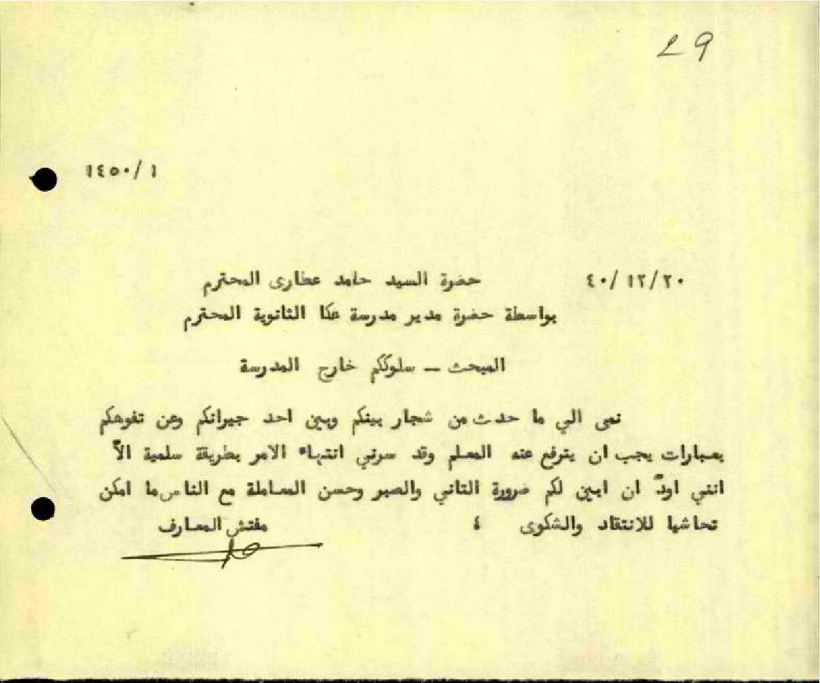 رسالة من مفتش المعارف الى المعلم حامد عطاري بخصوص سلوكه خارج المدرسة
