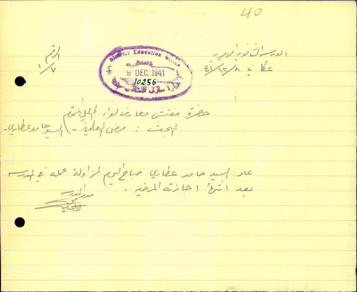 رسالة من مدير مدرسة عكا الى مفتش المعارف يخبره بأ المعلم حامد عطاري قد عاد الى العمل