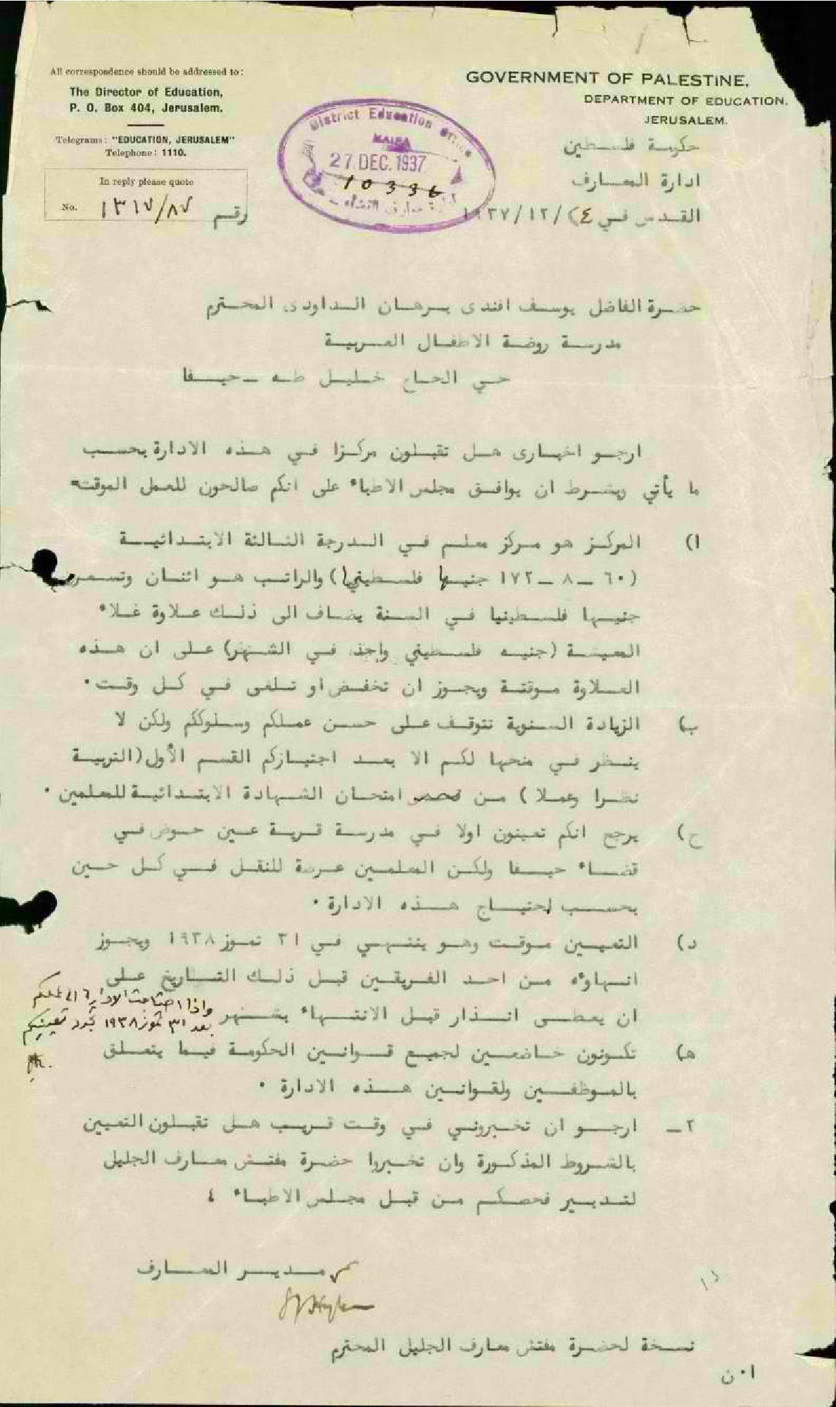 رسالة من مدير المعارف الى المعلم يوسف برهان الداودي يعرض عليه العمل كمدرس في مدرسة روضة الأطفال العربية