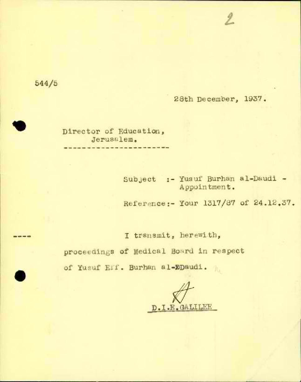 رسالة من مفتش المعارف الى مدير المعارف بخصوص التقرير الطبي لتعيين المعلم يوسف برهان الداودي