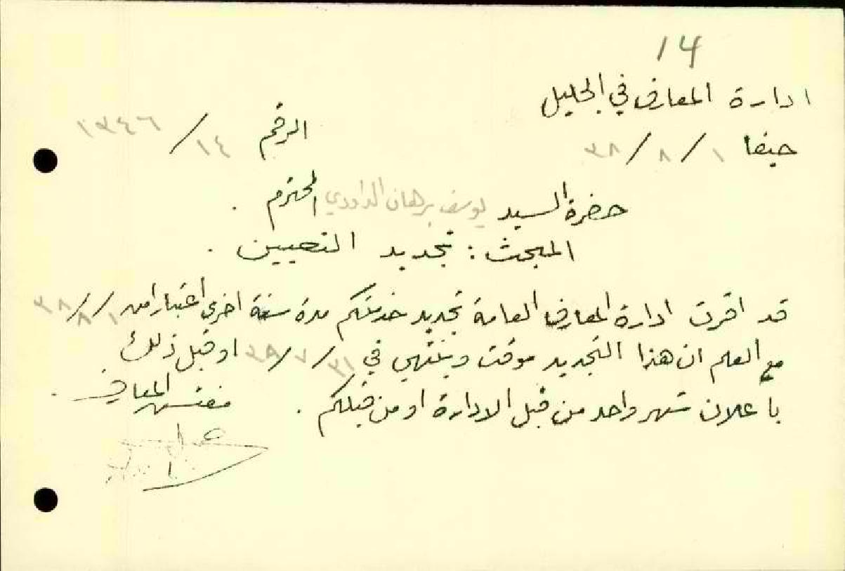 رسالة من مفتش المعارف الى المعلم يوسف الداودي بخصوص تجديد تعيينه في الادارة