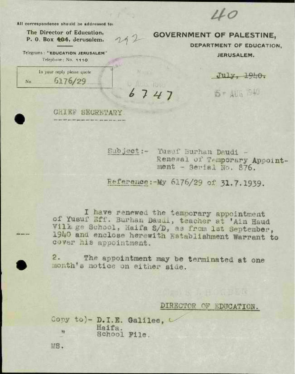 رسالة من مدير المعارف الى رئيس السكرتارية بخصوص تجديد تعيين المعلم يوسف الداودي