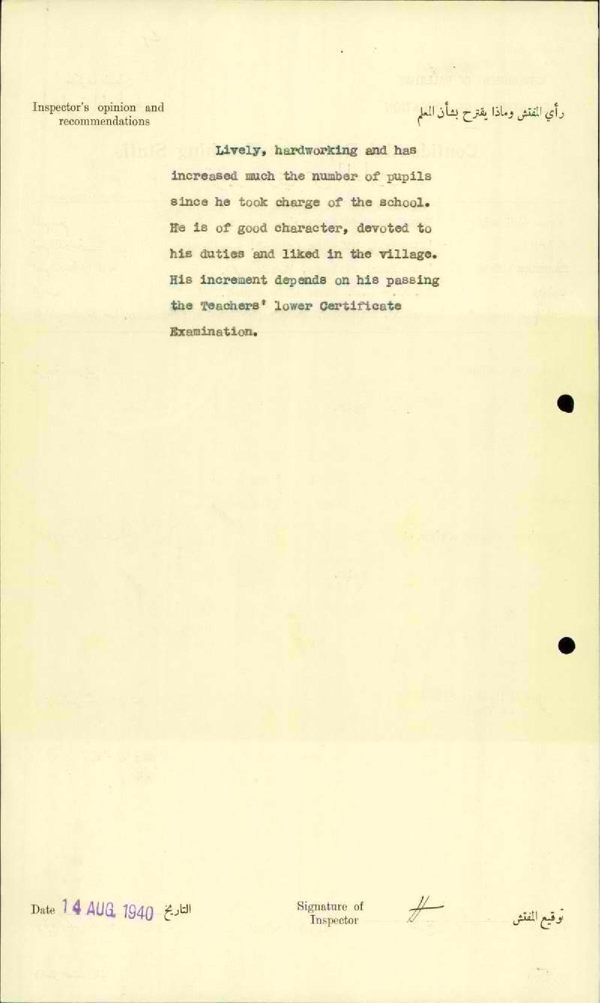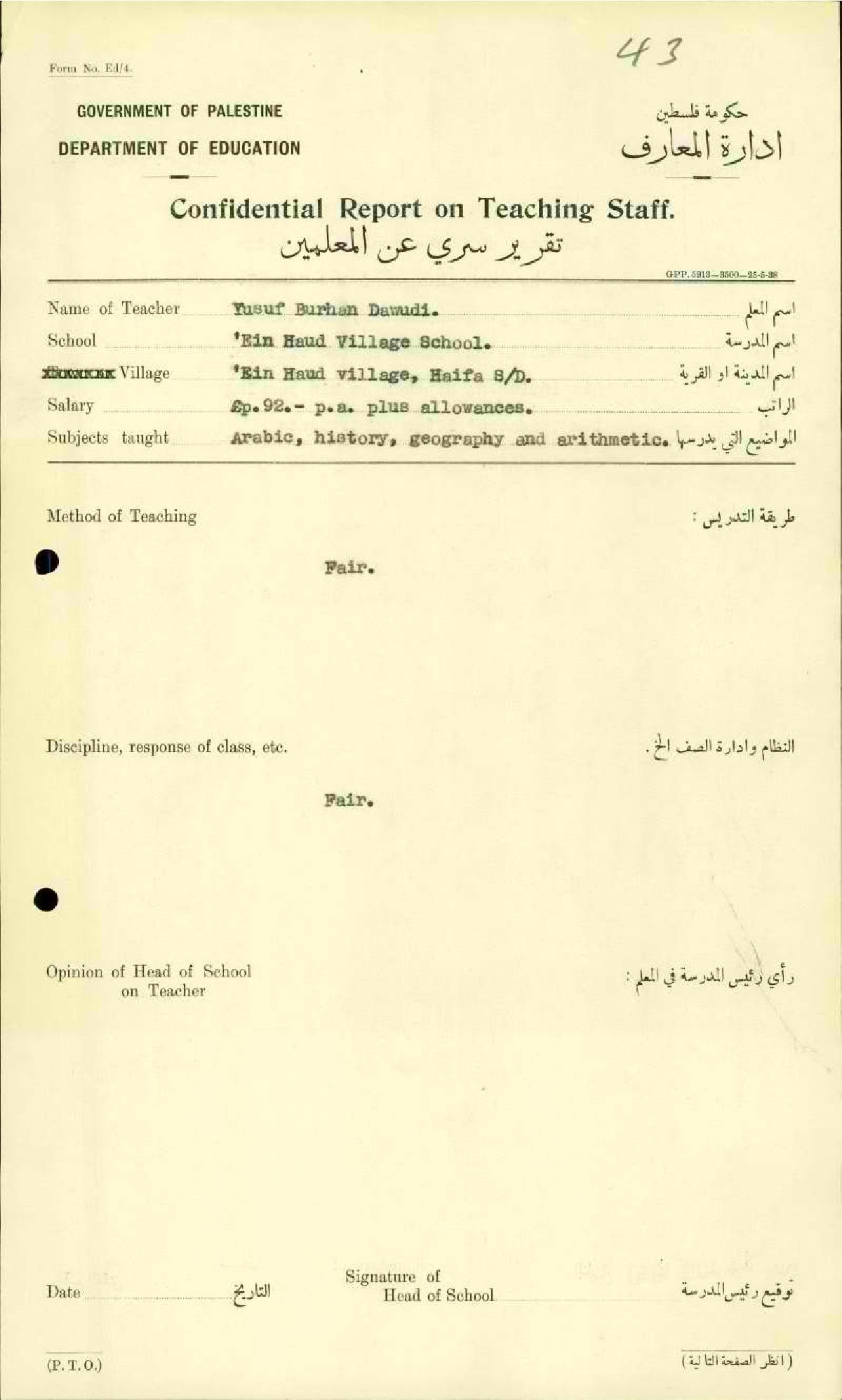 تقرير تفصيلي عن أداء المعلم يوسف برهان الداودي في مدرسة عين حوض سنة 1940