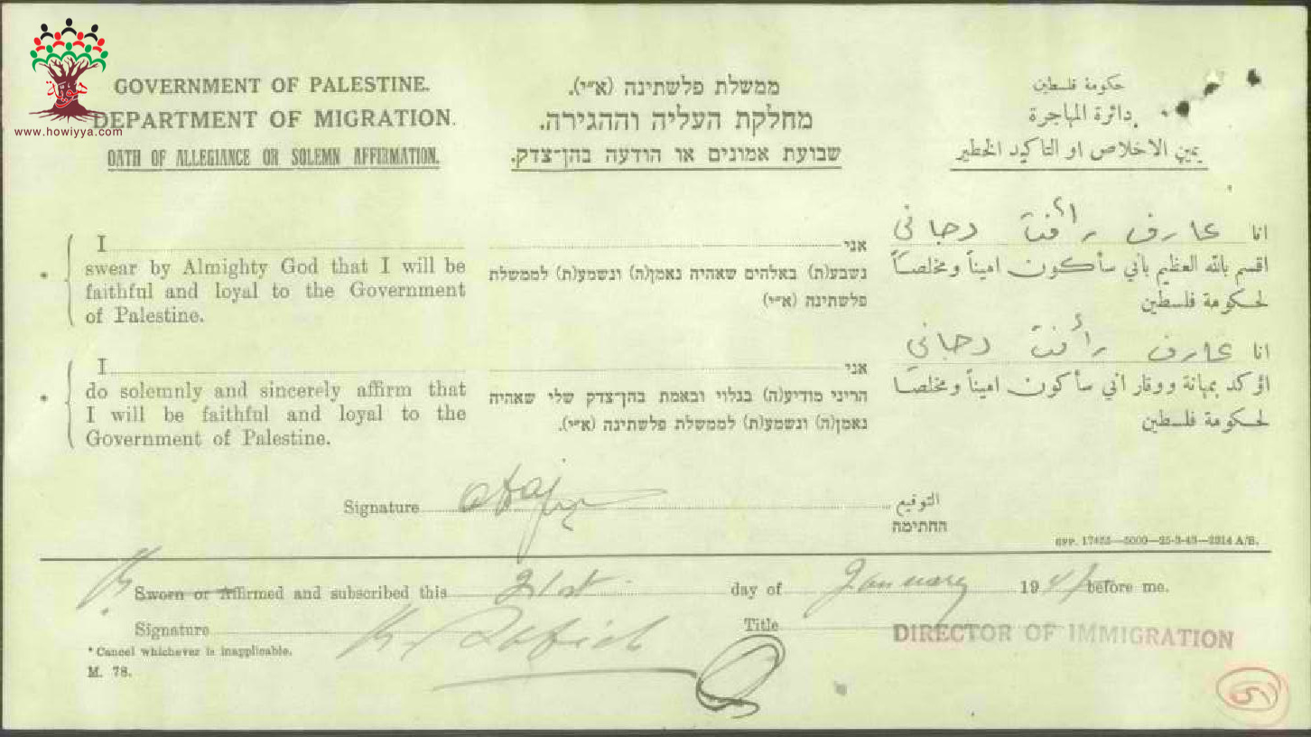 عارف رأفت الدجاني يوقع يمين الاخلاص للحصول على الجنسية الفلسطينية