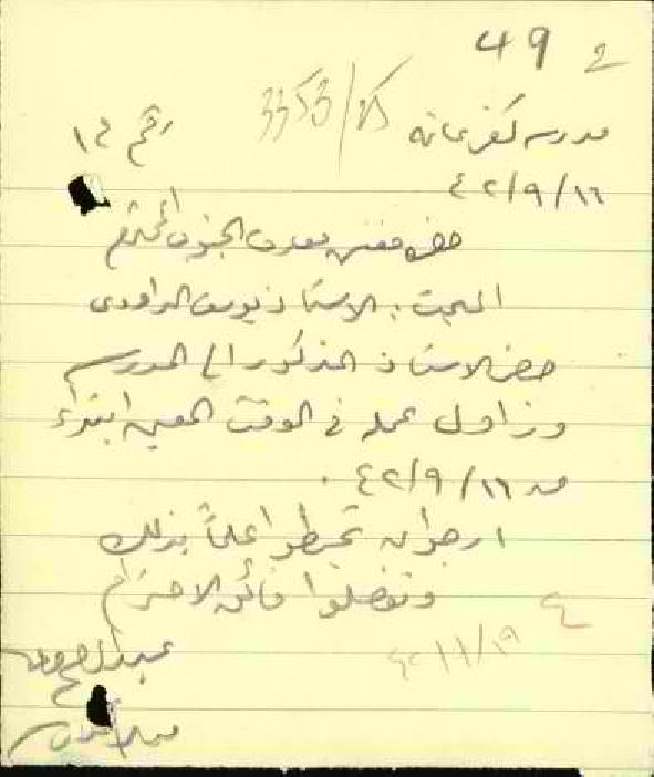 رسالة من المعلم يوسف الداودي الى مفتش المعارف يطلب فيها زيادة غلاء معيشة