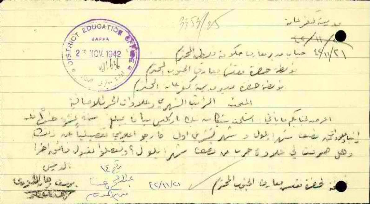 رسالة من المعلم يوسف الداودي الى مفتش المعارف بخصوص رابته الشهري وعلاوة الحرب الاضافية