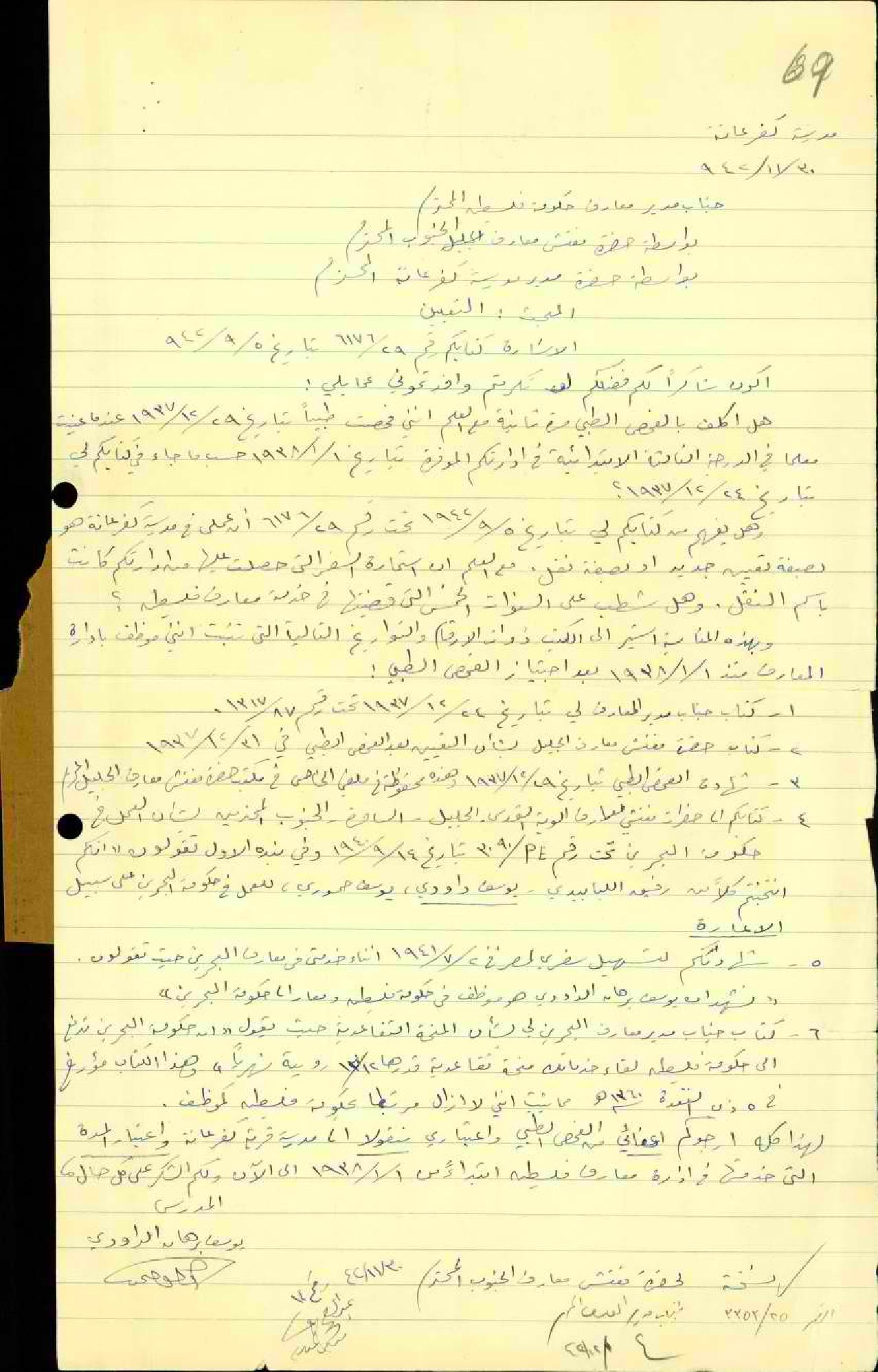 رسالة من المعلم يوسف الداودي الى مفتش المعارف يستفسر فيها عن اعادة تعيينه