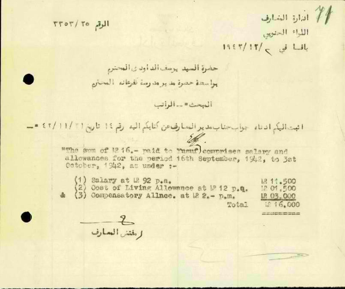 رسالة من مفتش المعارف الى المعلم يوسف الداودي بخصوص راتبه وعلاواته