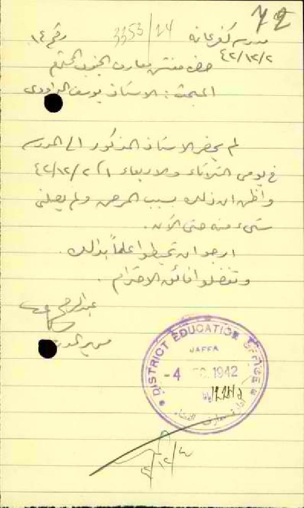 رسالة من مدير مدرسة كفر عانة الى مفتش المعارف بخصوص تغيب المعلم يوسف الداودي بسبب المرض