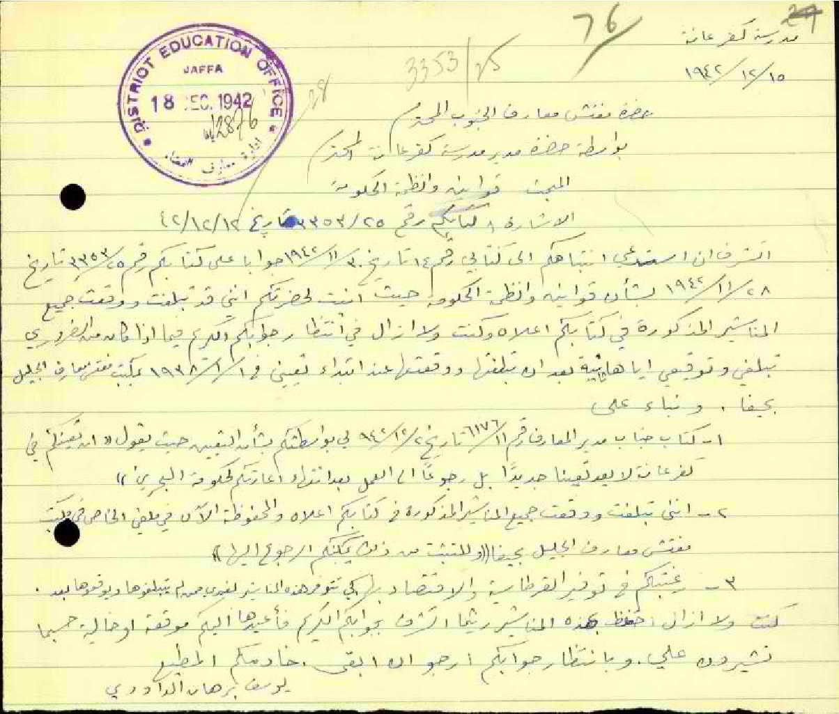 رسالة من المعلم يوسف الداودي الى مفتش المعارف بخصوص قوانين وأنظمة الحكومة