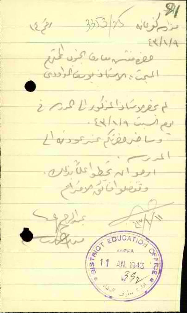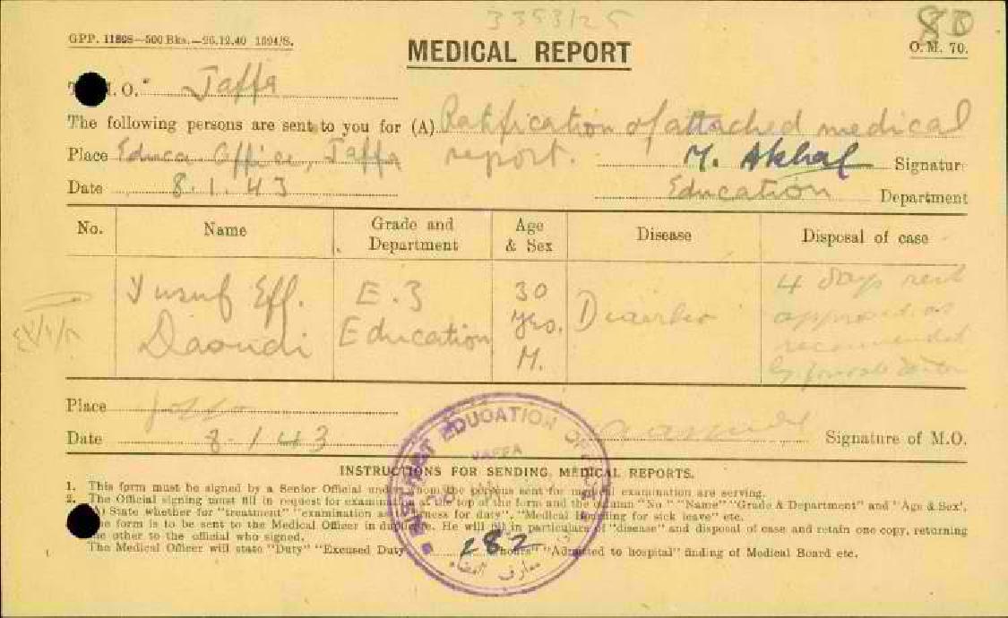 رسالة من مدير مدرسة كفر عانة الى مفتش المعارف بخصوص تغيب المعلم يوسف الداودي مرفقة بالتقرير الطبي