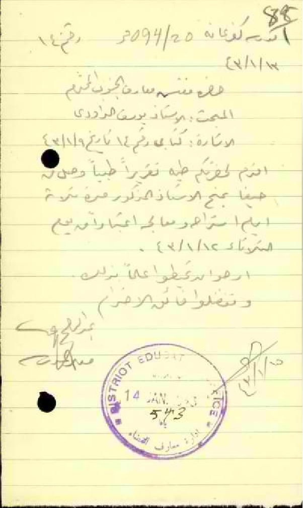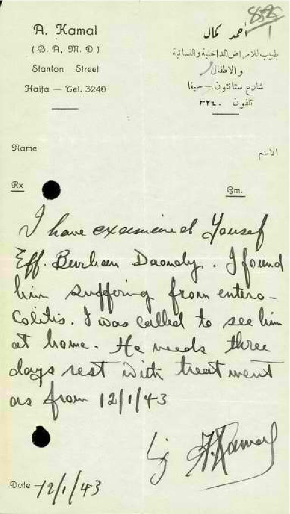 رسالة من مدير مدرسة كفر عانة الى مفتش المعارف بخصوص تغيب المعلم يوسف الداودي مرفقة بالتقرير الطبي