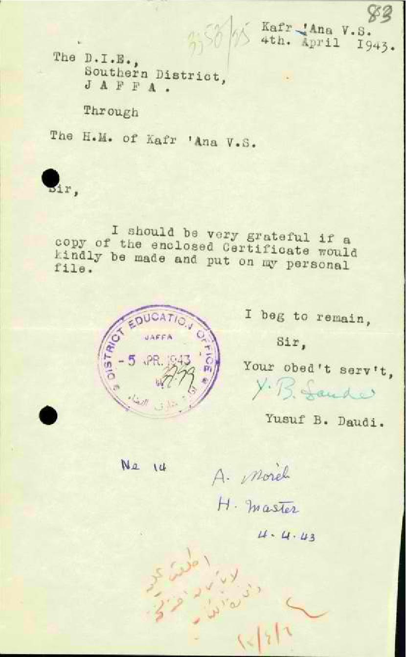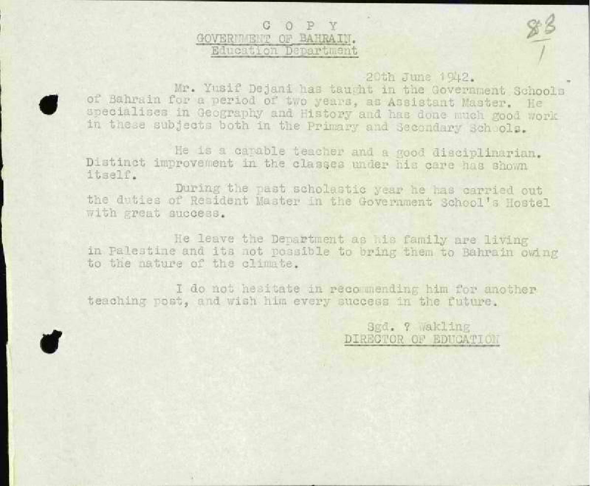رسالة من المعلم يوسف الداودي الى مفتش المعارف مرفقة بشهادة من ادارة المعارف في البحرين يطلب ضمها الى ملف خدمته
