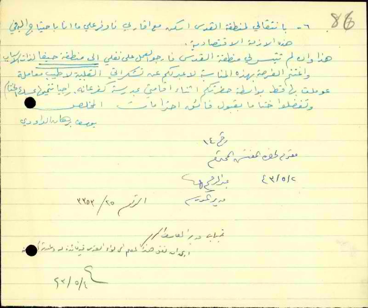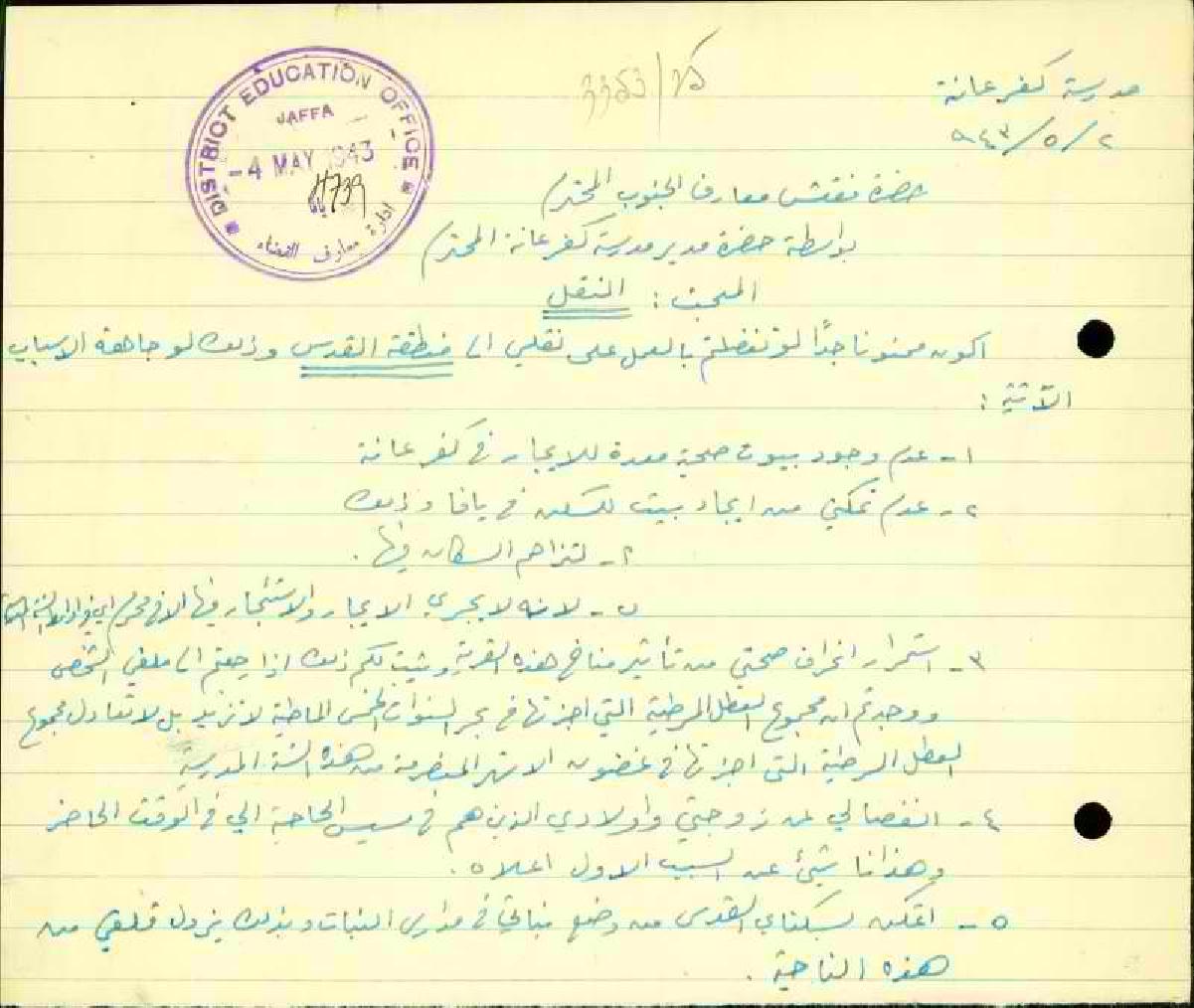 رسالة من المعلم يوسف الداودي الى مفتش المعارف يطلب فيها نقله من مدرسة كفر عانة