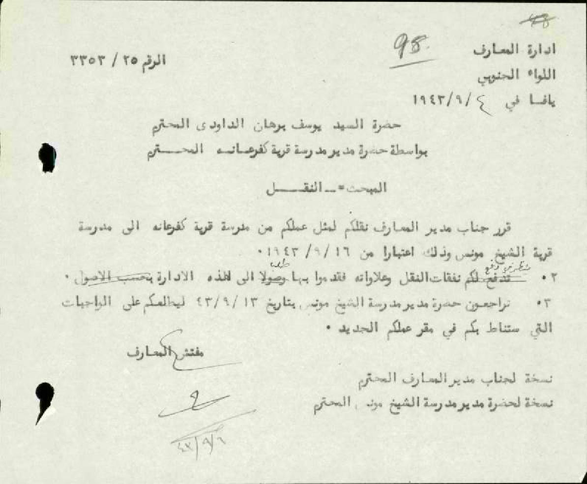 نقل المعلم يوسف الداودي من مدرسة كفر عانة الى مدرسة الشيخ مؤنس