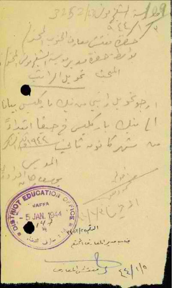 رسالة من المعلم يوسف الداودي الى مفتش المعارف يطلب فيها تحويل راتبه الى بنك باركليس