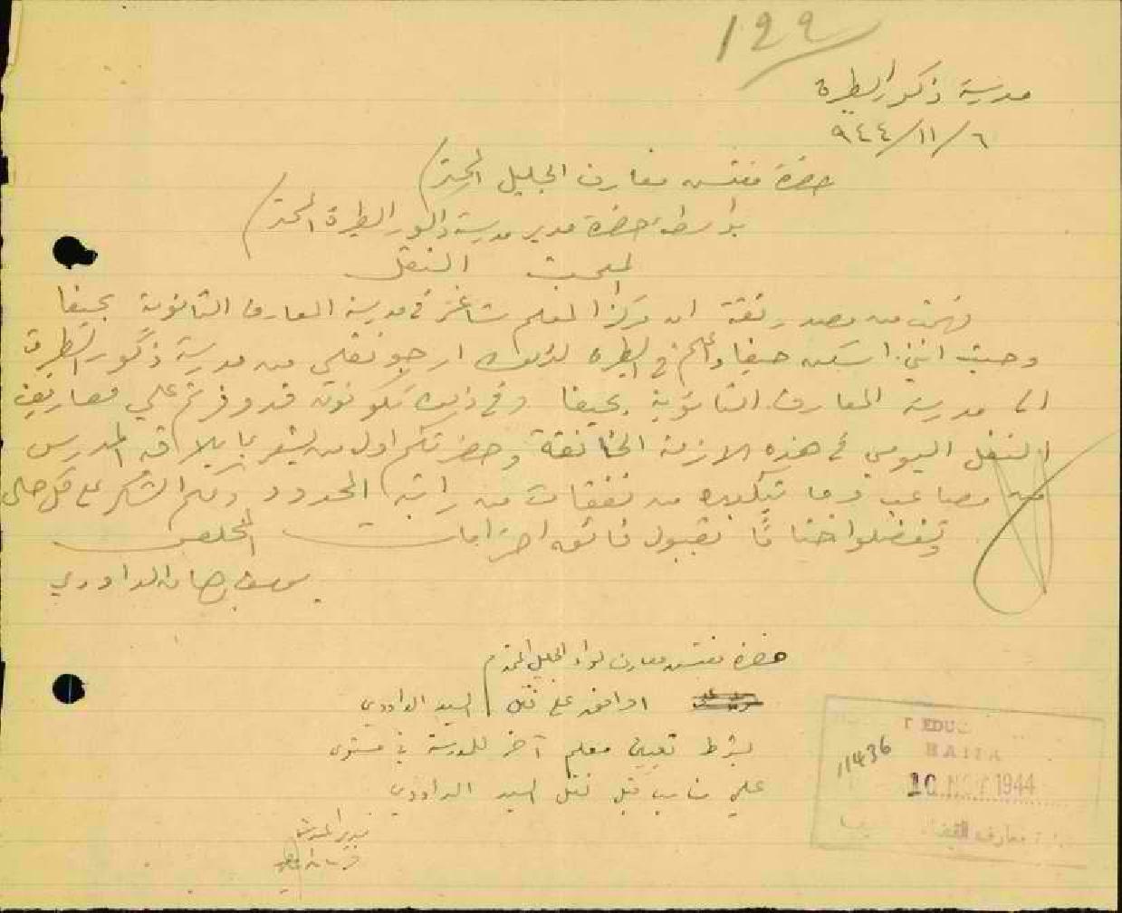 رسالة من المعلم يوسف الداودي الى مفتش المعارف يطلب فيها نقله من مدرسة الطيرة الى مدرسة العارف في حيفا