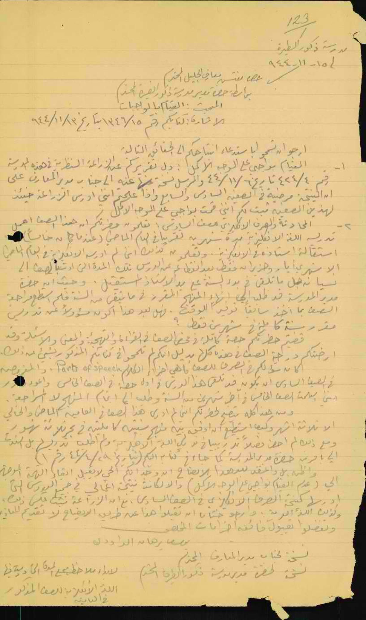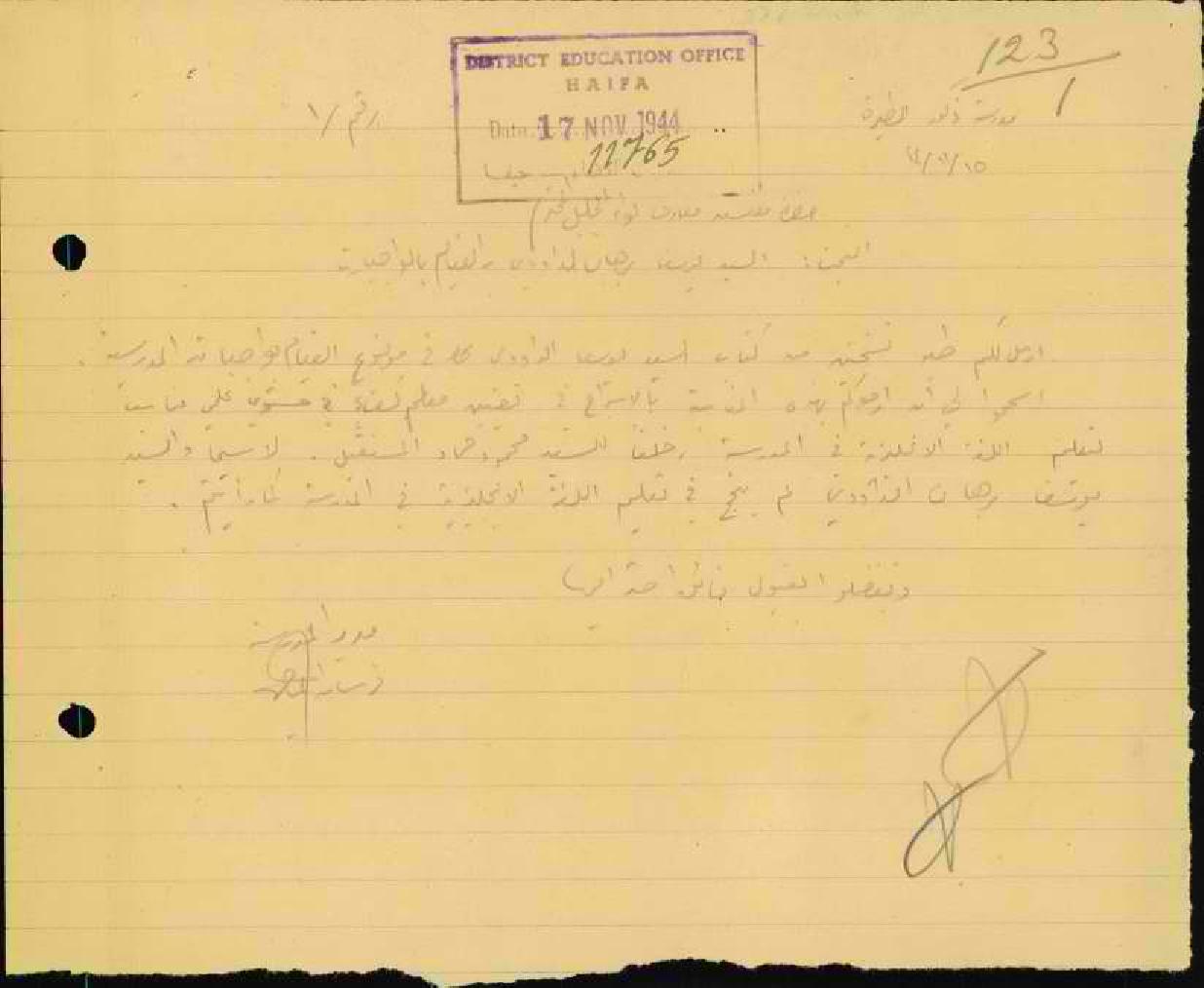 رسالة من مدير مدرسة الطيرة الى مفتش المعارف مرفقة برسالة من المعلم يوسف الداودي بخصوص أدائه والقيام بالواجبات