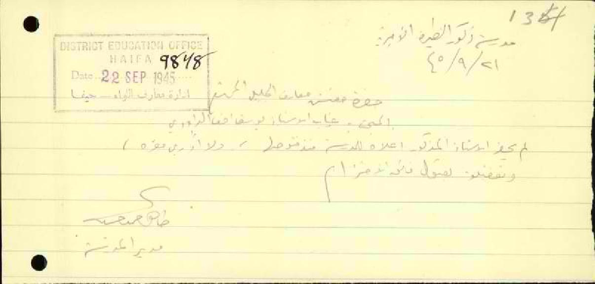 رسالة من مدير مدرسة الطيرة الى مفتش المعارف بخصوص تغيب المعلم يوسف الداودي