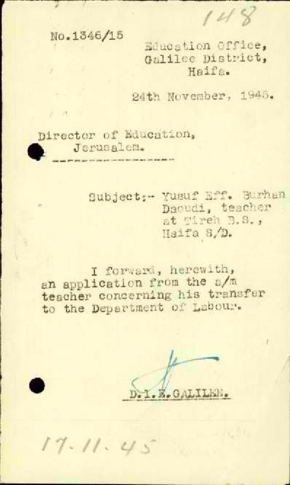 رسالة من مفتش المعارف الى مدير المعارف مرفقة بطلب من المعلم يوسف الداودي لنقله من مدرسة الطيرة