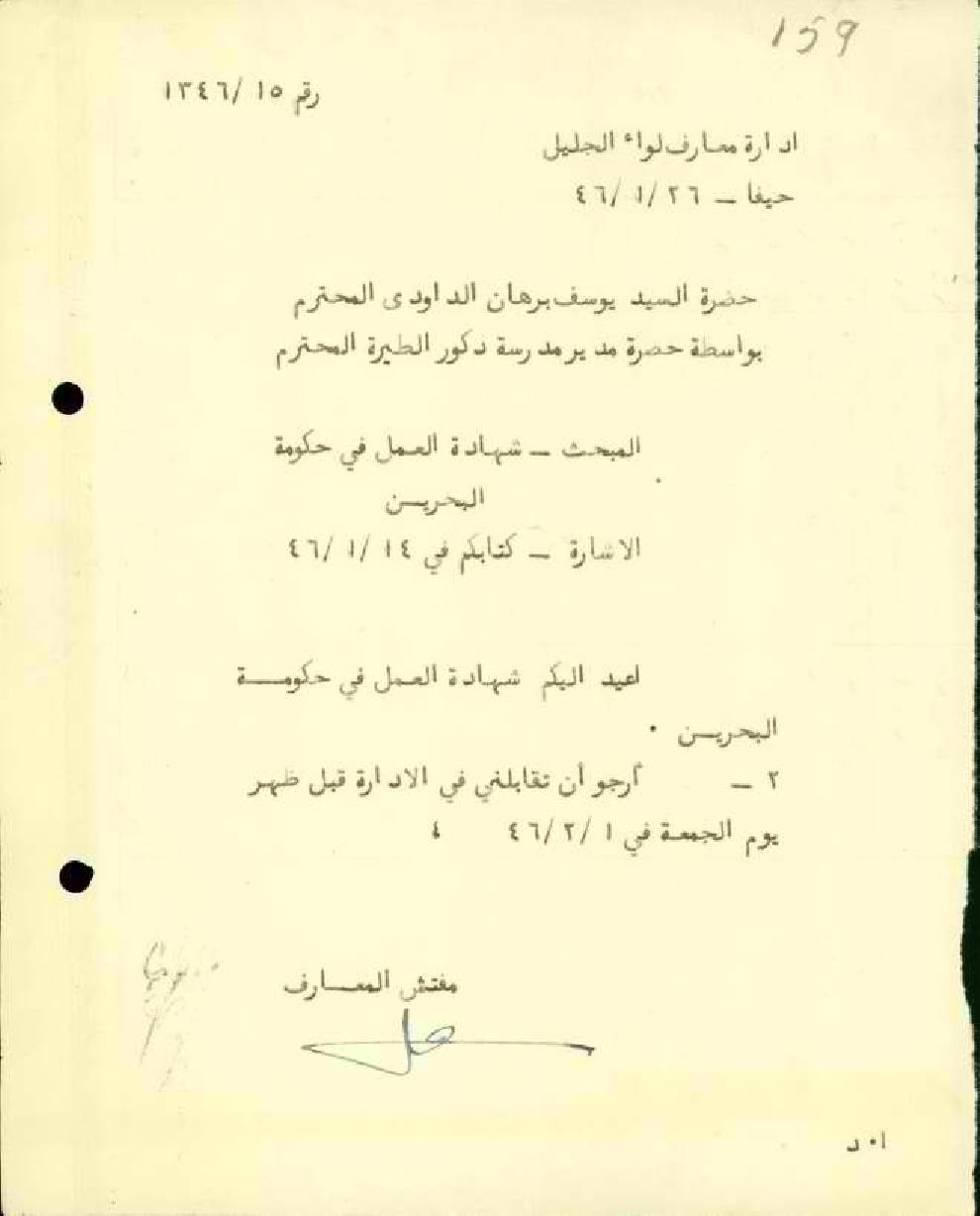 رسالة من مفتش المعارف الى المعلم يوسف الداودي مرفقة بشهادة خدمته في البحرين