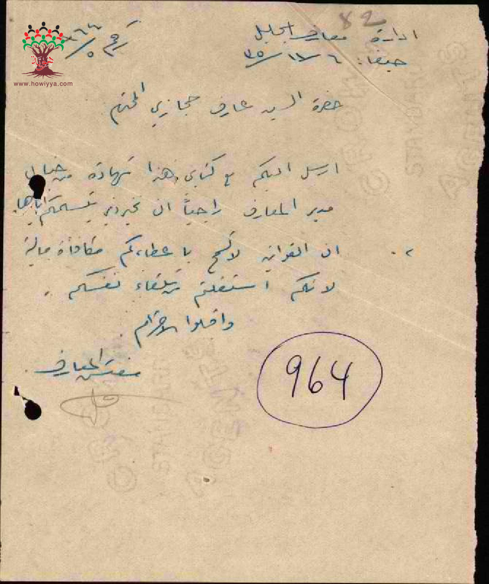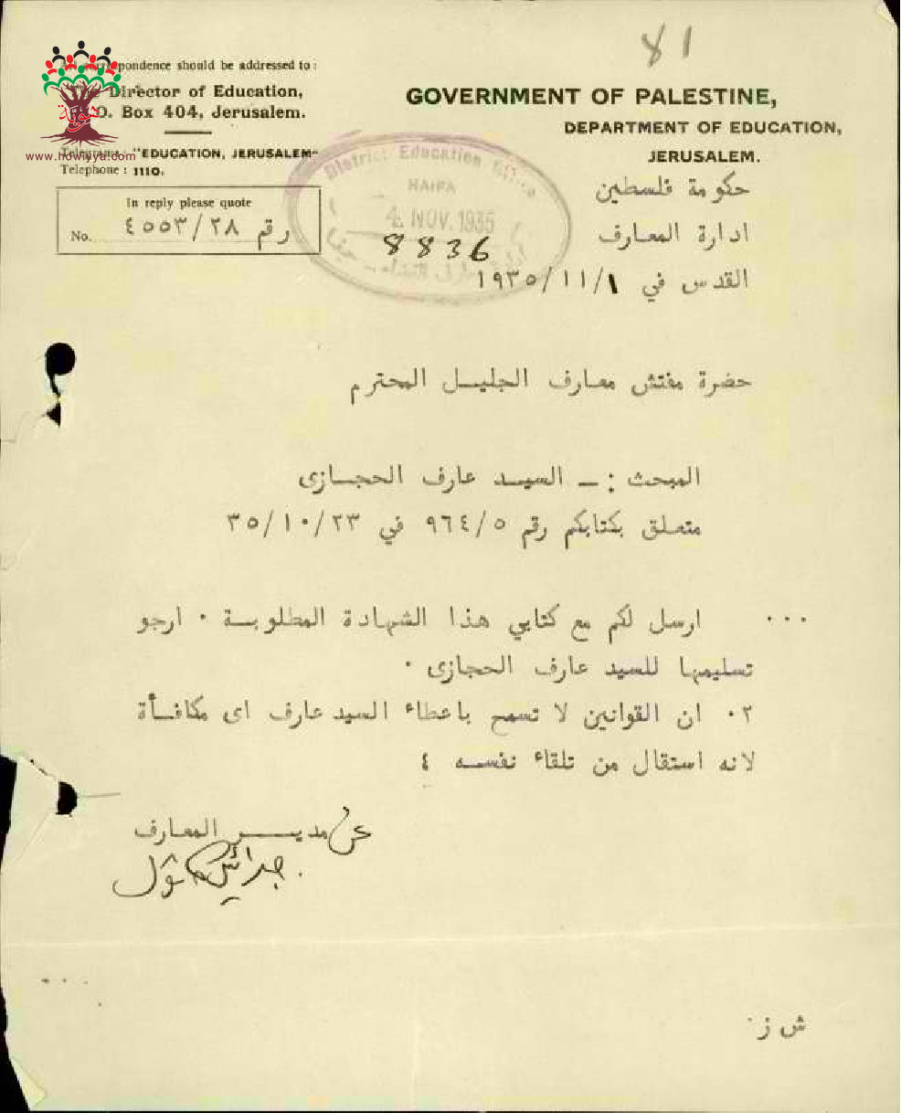 رفض صرف المكافأة للمعلم حجازي بسبب استقالته - صفد - مدرسة حيفا